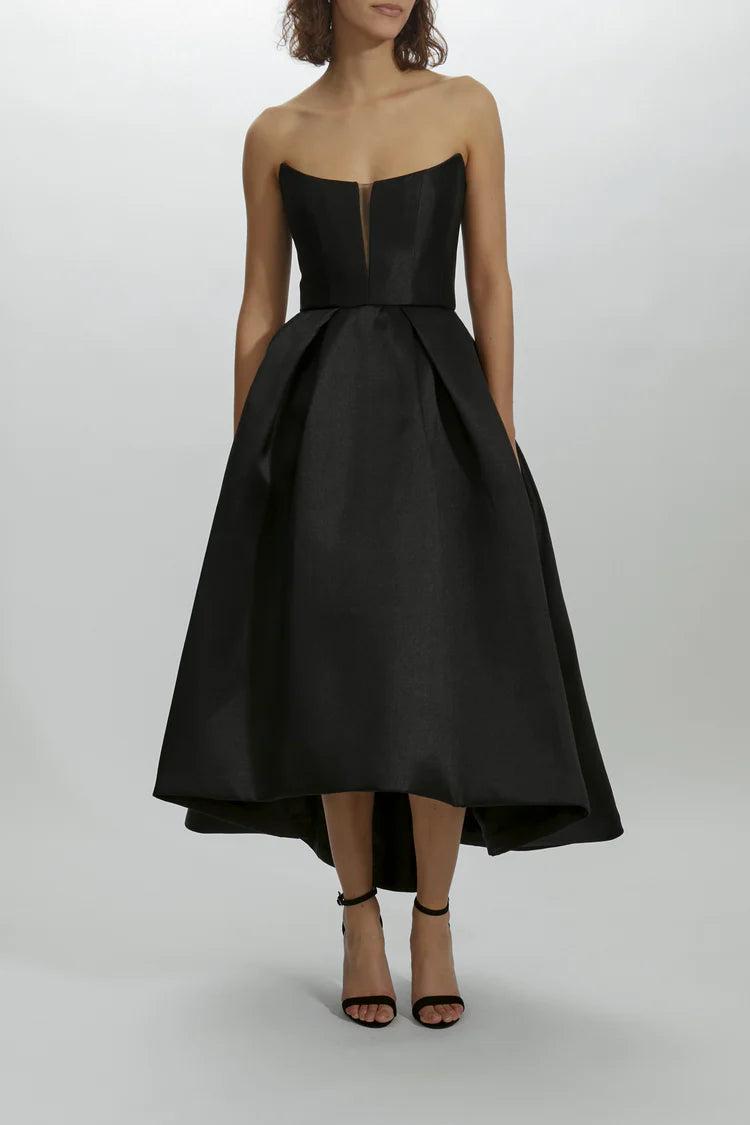 Long dresses are the standard for a black tie wedding, but you can wear a midi dress if it’s as formal as the Amsale P456M Evening Dress. Detailed with a strapless scoop neck with an illusion insert, this dress features a full A-line skirt with structured pleats, side pockets, and a high-low hem.