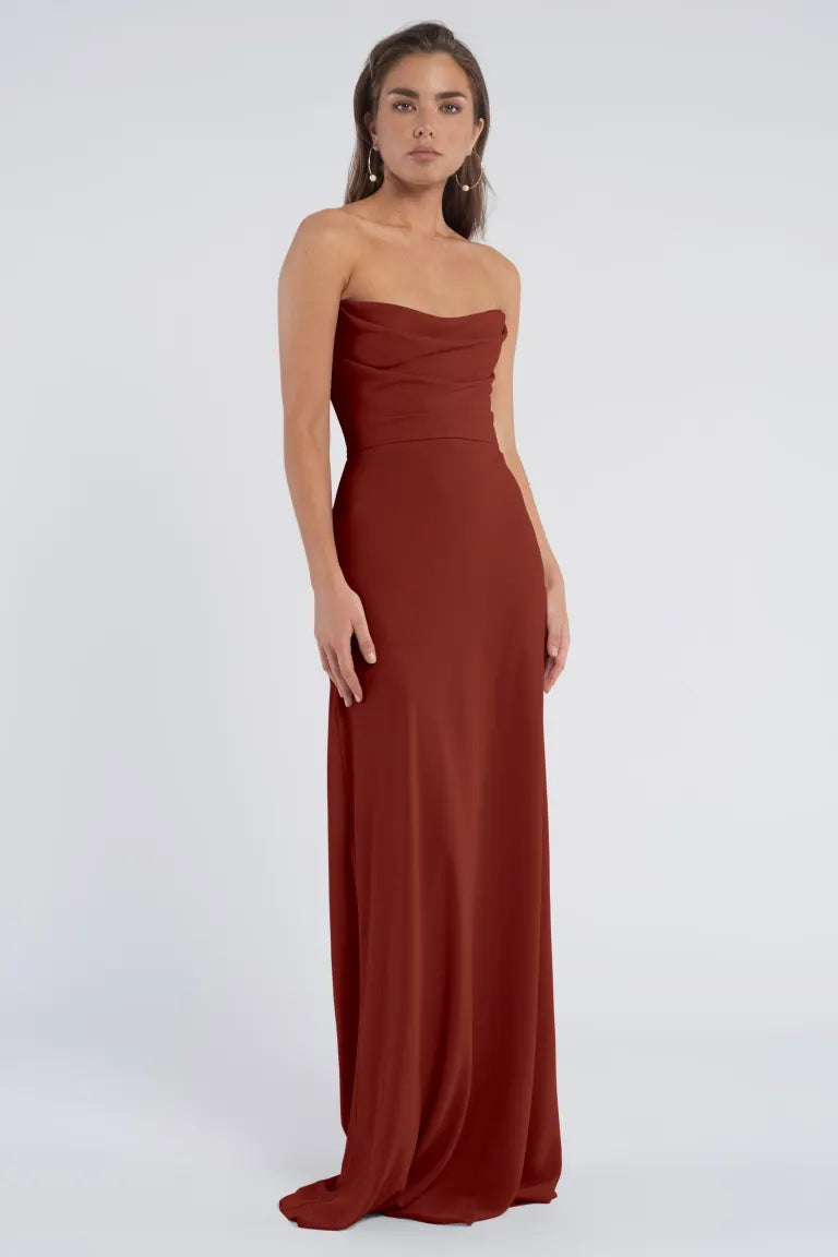 The Jenny Yoo Liv dress is oh-so-chic in pebbled crepe fabric. Clean and modern, this gown features a strapless bodice with a draped cowl neck and a bias-cut skirt. The unadorned, minimalist aesthetic makes it easy to pair with all sorts of jewelry and hair accessories.