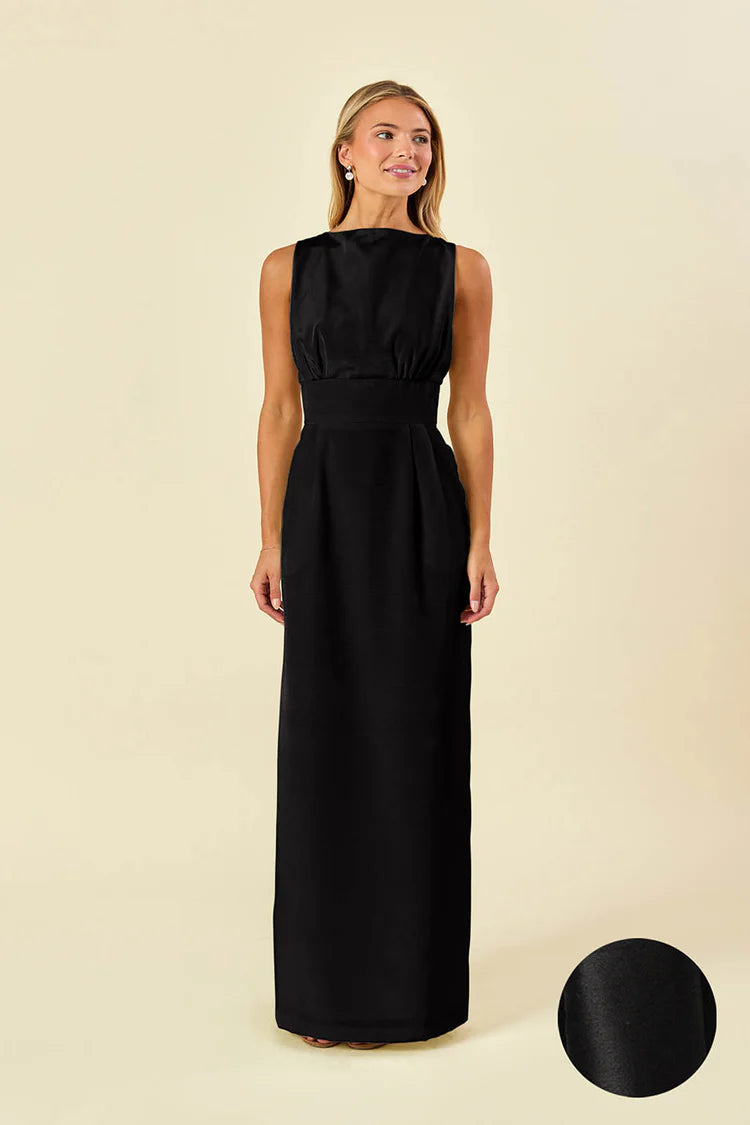 In faille fabric that makes it perfect for fall or winter, the LulaKate Sabrina Bodice with Long Brunch Skirt is timeless and modern at the same time. This formal dress features a straight-column silhouette with a sleeveless bodice, a boat neckline, and a wide inset waistband with subtle pleat details.