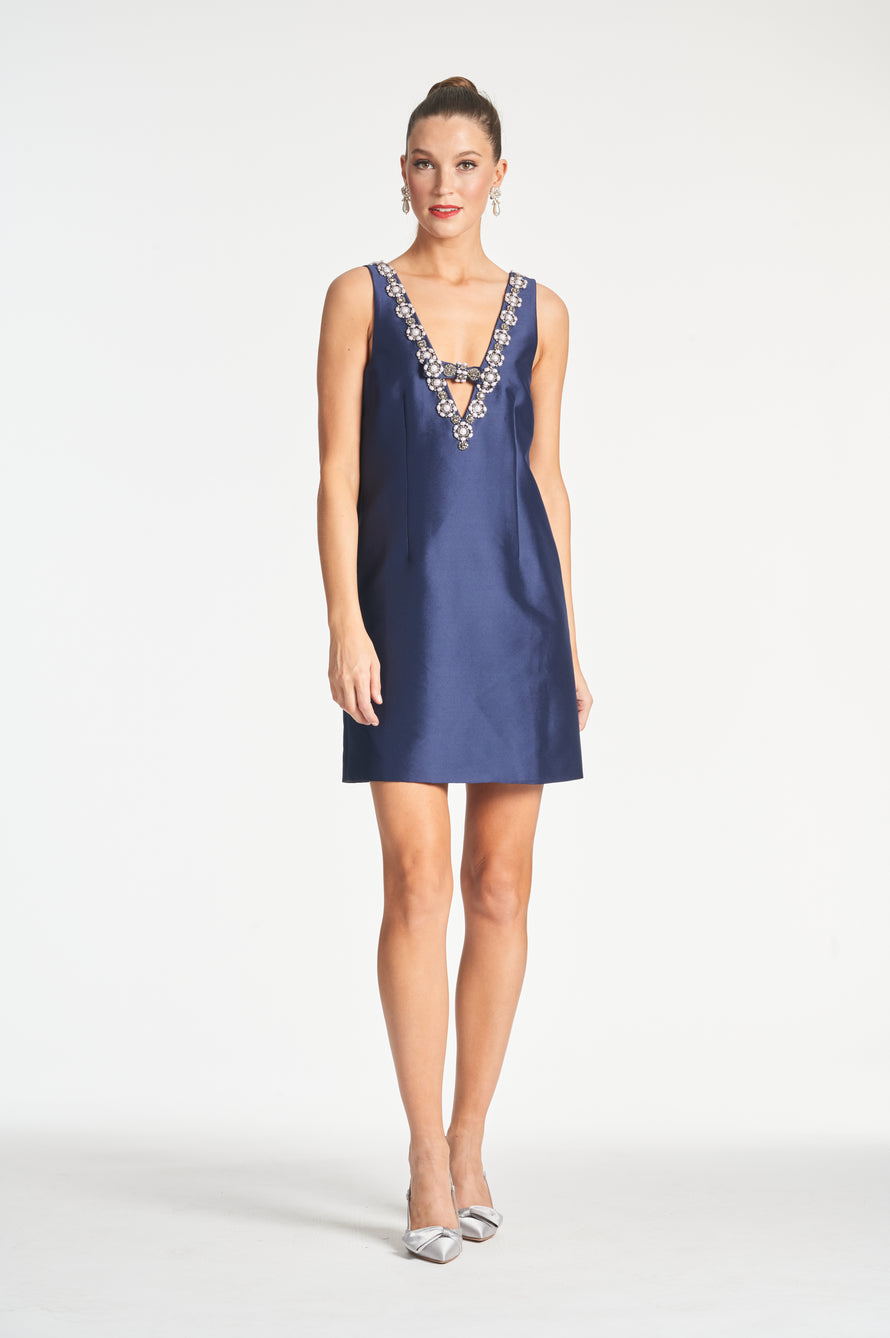 The Sachin & Babi Sylvie Dress, in Mikado fabric with an above-the-knee hemline, features crystal embellishments that add shimmer and shine. This classic look also features a flattering V-neckline with a cutout detail, a low V-back, and vertical darts that nip in the waist.