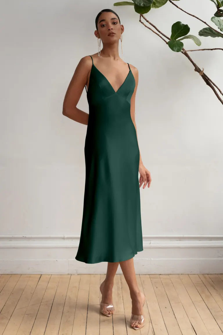 The Jenny Yoo Bellini Dress is timeless, in a slip silhouette with spaghetti straps, a V-neckline, a scoop back, and a bias-cut midi skirt. This luxe satin design is appropriate for wearing in any season and is available in over two dozen colors.