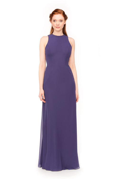 We love this dress for its Audrey Hepburn Old Hollywood vibes, featuring a high neckline and captivating open back. Made from luxe chiffon, this sleek and sophisticated gown is perfect for the most special occasion. And your bridal party will look — and feel — stunning in it.