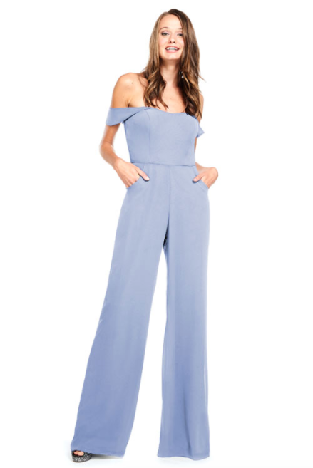 Offering a fresh spin on the traditional dress, this sleek chiffon off-the-shoulder jumpsuit has it all. It features a sweetheart bodice, a natural waist, and an invisible back zipper. It’s modern and unexpected yet still formal and femme.