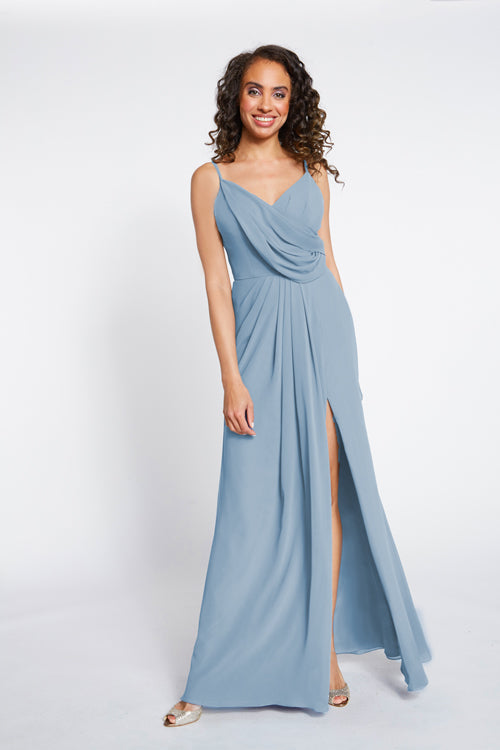 With movement reminiscent of a waterfall, this long dress with V-neck and spaghetti straps is a stunning combo of ball gown and goddess. It features a pleated skirt with a tantalizing thigh-high cut. That makes it the ideal dress to show off a pair of heels without sacrificing length or overall sumptuousness.