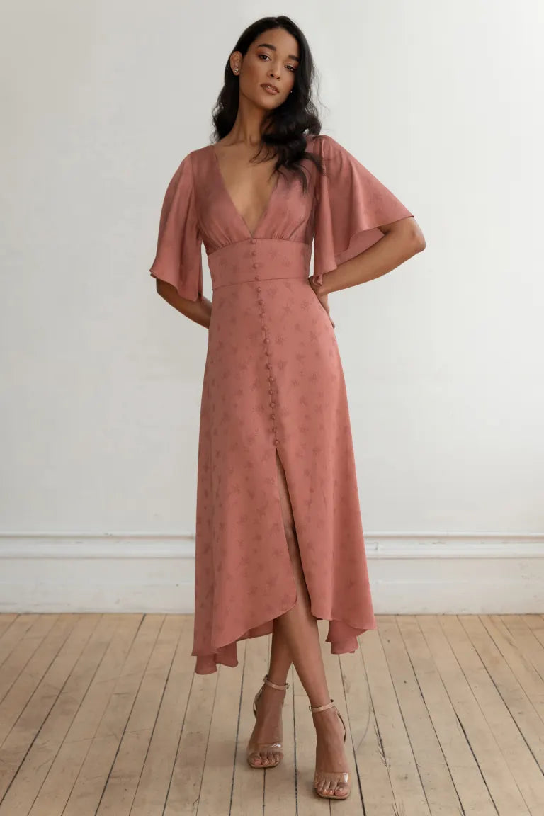 Flutter sleeves, a cummerbund waist, and a shark bite hem make the Jenny Yoo Lunetta Dress a romantic option for a wedding rehearsal dinner. This midi dress features a subtle rosette texture, a V-neckline, an open back with a tie at the back of the neck, and little front buttons. A center front slit allows it to move and flow!