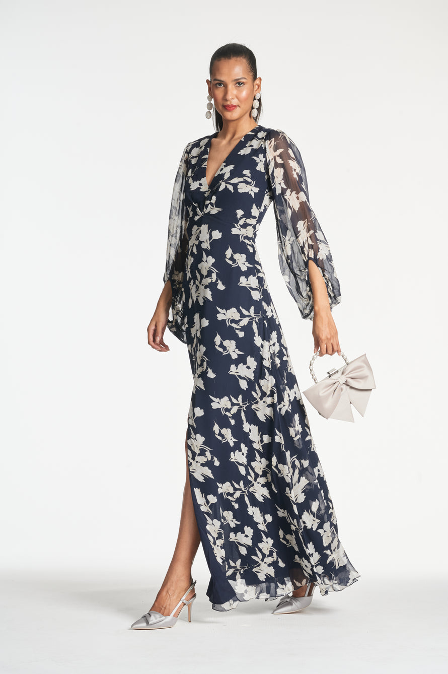 The Sachin and Babi Jenny Gown is an incredibly versatile look you can easily wear to various future parties and events. In soft satin crepe with a large all-over floral print, this dress features long sleeves, a front slit, and a flowy empire waist silhouette.