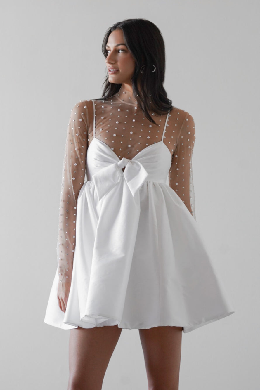 Femme, flirty, and fun, no one will forget who the bride is in this little number, with an off-the-shoulder neckline and exuberant ruffles. This fitted mini dress made of textured stretch satin gets the after party started.