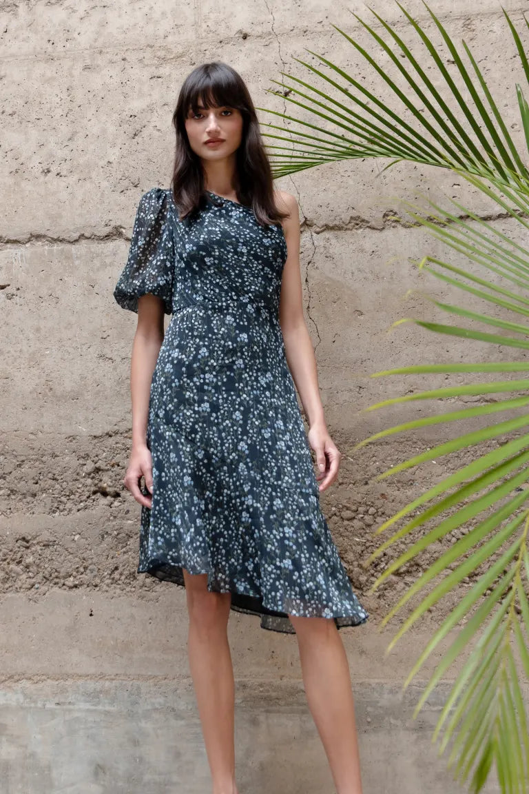 The Jenny Yoo Jasmine Dress offers a soft, romantic look with a one-shoulder bodice and one short puffed sleeve. This crinkle chiffon midi dress, detailed with an asymmetrical hem and pretty all-over print, works for various celebrations.