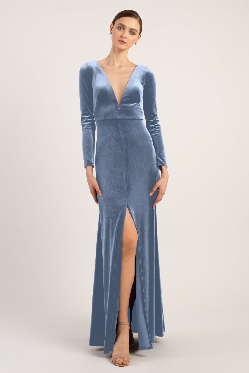 Made from stretch velvet, this open-back dress with a show-stopping V-neck and sultry center skirt slit is a real show-stopper. It’s perfect for a formal winter wedding!