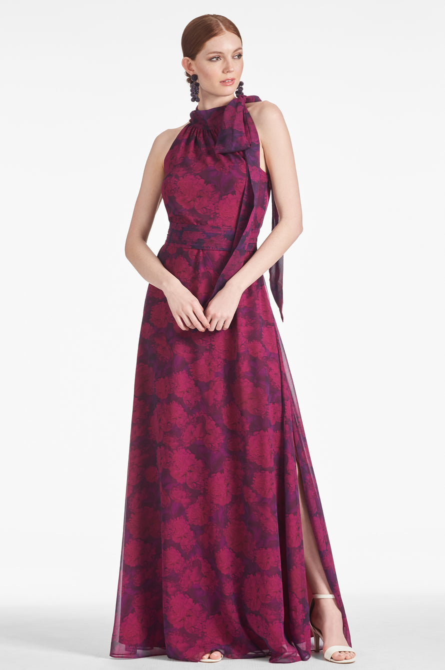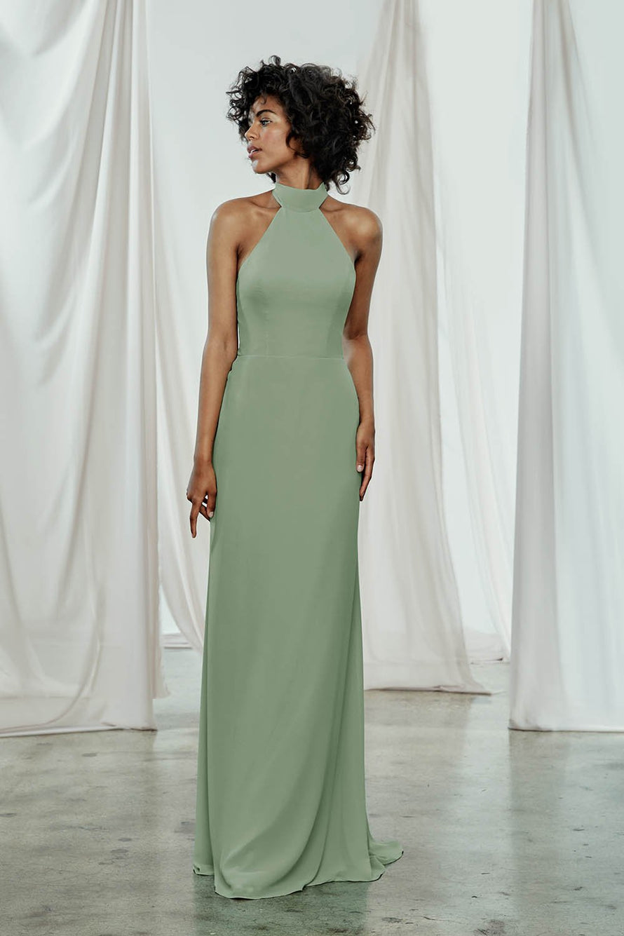 We’re smitten with this full-length chiffon gown with a high collar and halter neckline. It’s elegant and sophisticated without even trying. This dress is ideal for a classic black tie or formal wedding.