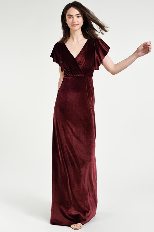 This floor-length gown made from stretch velvet has delicate flutter sleeves, an open back, and a gorgeous V-neck bodice. It’s an obvious choice for a formal or even semi-formal winter wedding celebration.