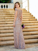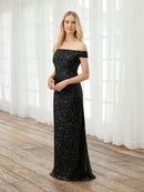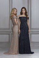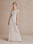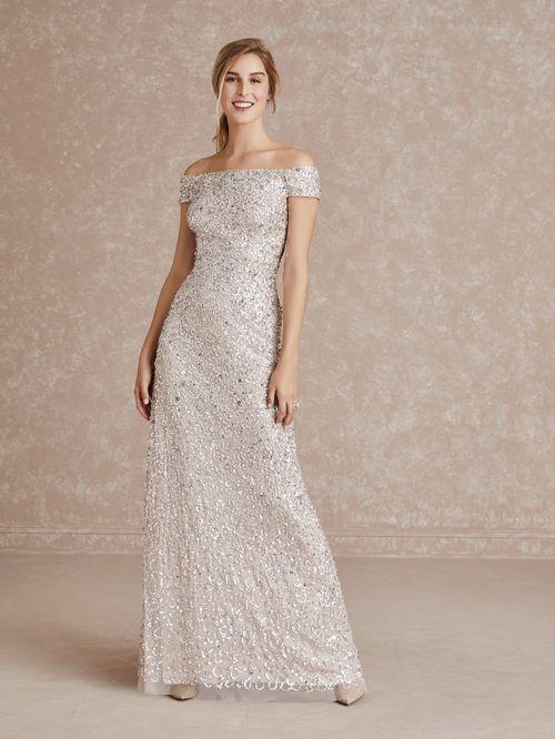 The dress has off the shoulder sleeves and a back zipper. Tulle gown that simply captures light with its all over crunchy style sequins on mesh.