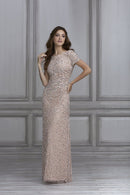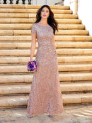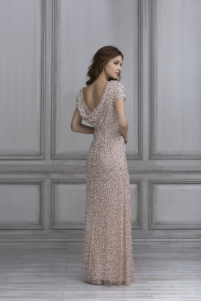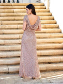 Crunchy style sequins gathered middle and a bateau neckline. The dress also comes with a cowl back for additional flare. Finished with a hidden side zipper that does not zip all the way up to sleeve end.
