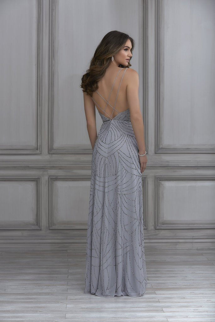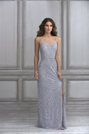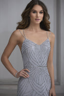V-neckline mesh gown shines with a fitted bodice and spaghetti straps. A front slit accents the skirt.