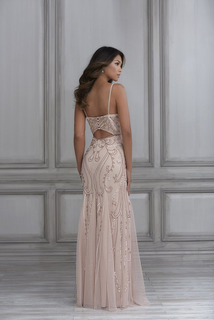 Trumpet dress with tulle godets with beaded waist. V-neckline with delightful thin straps. The button-up back forms a keyhole back above the zipper.
