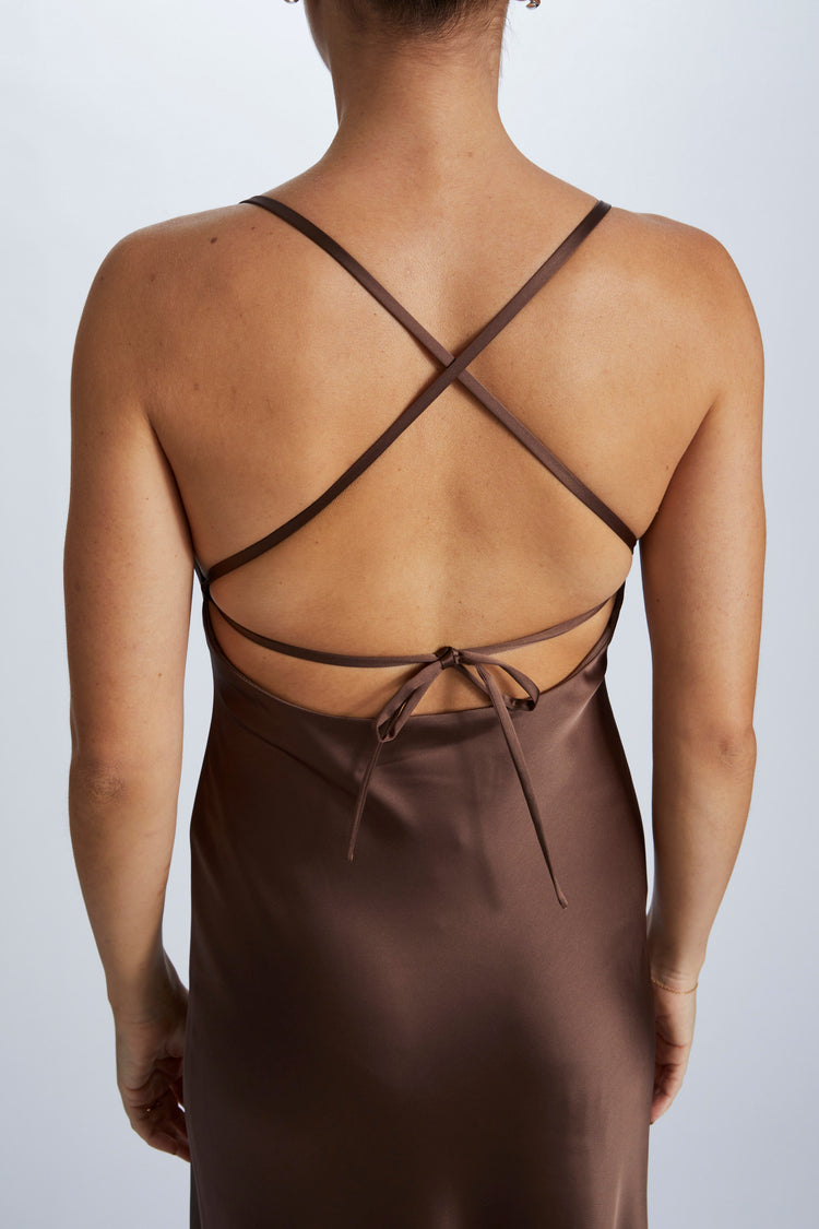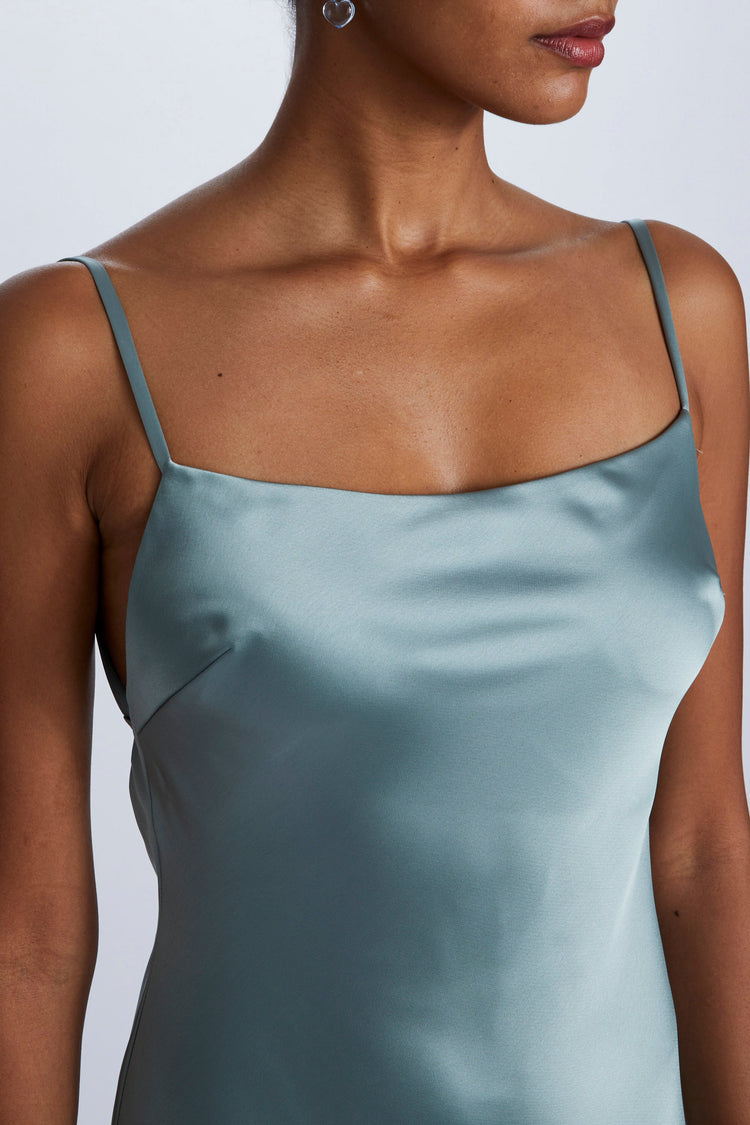 The Andy midi cocktail dress features a straight neckline, spaghetti straps and an open tie back in Fluid Satin.