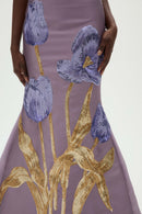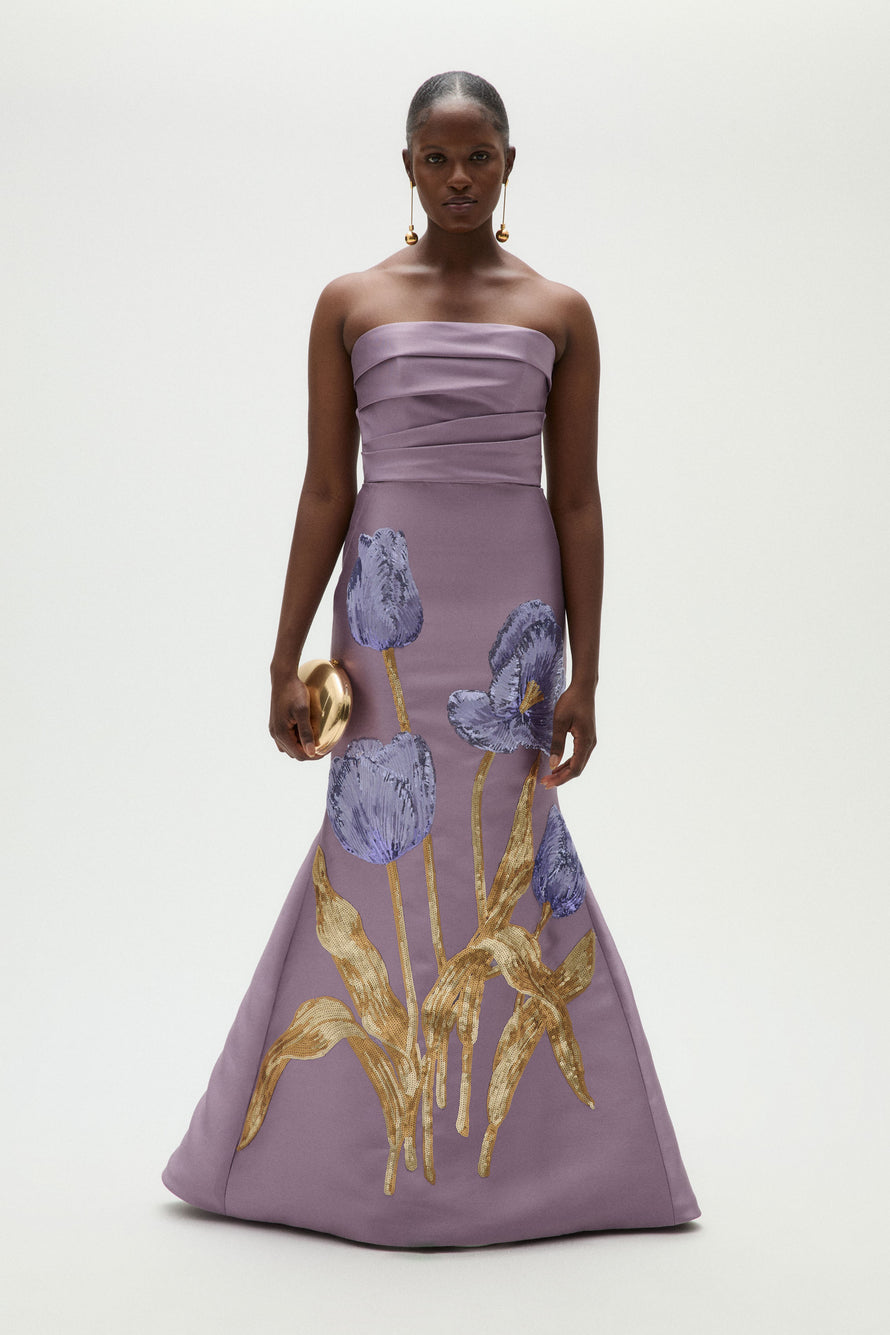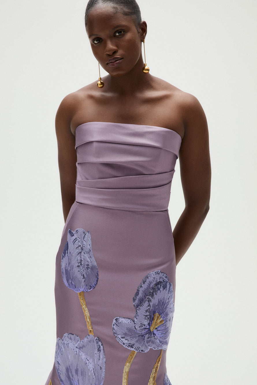 Mikado hand draped strapless fit-to-flare gown with oversized tulip sequin appliqué. Shown in Lilac.
