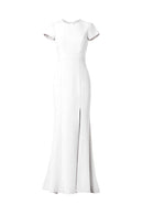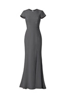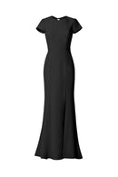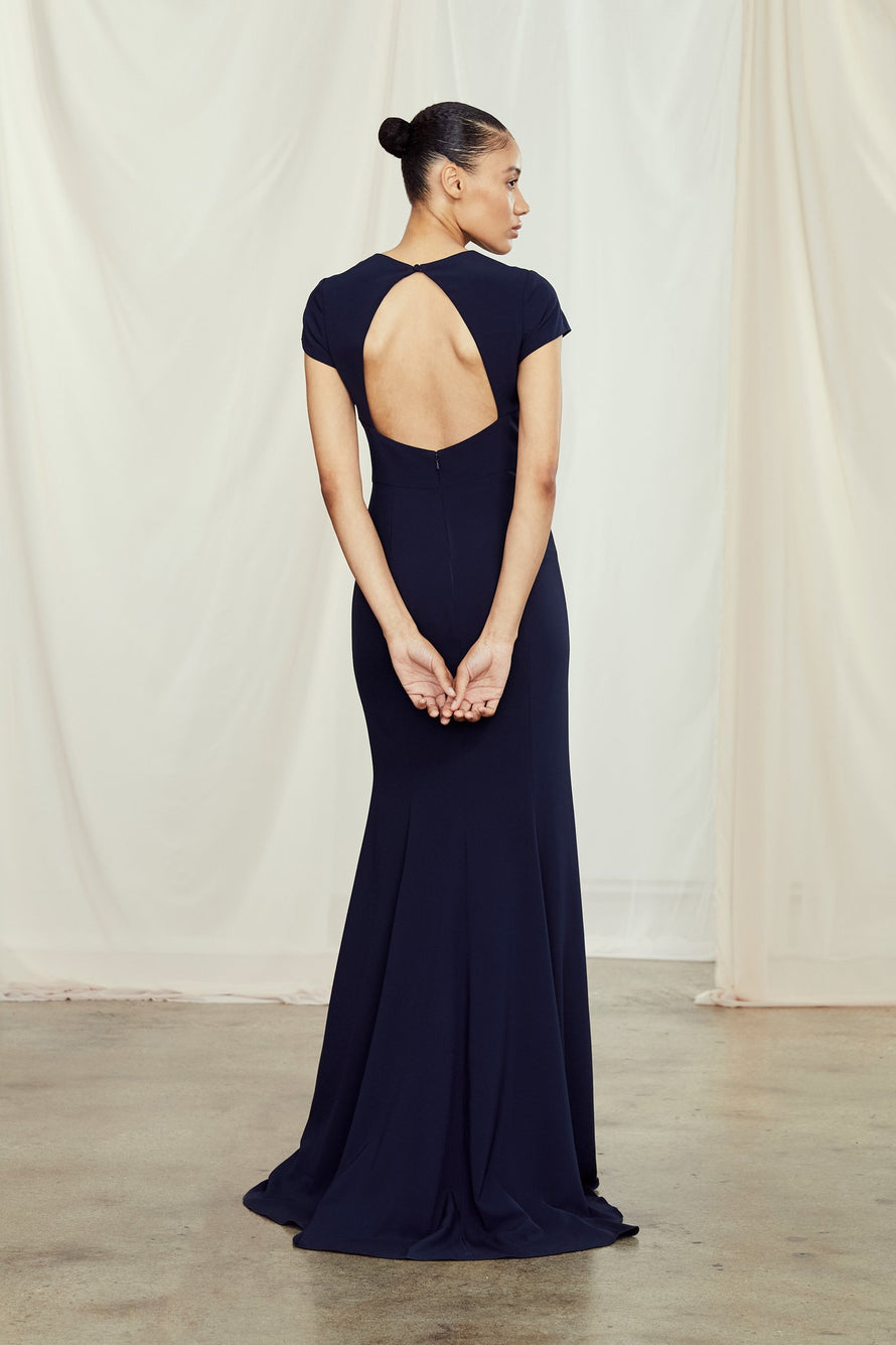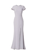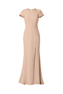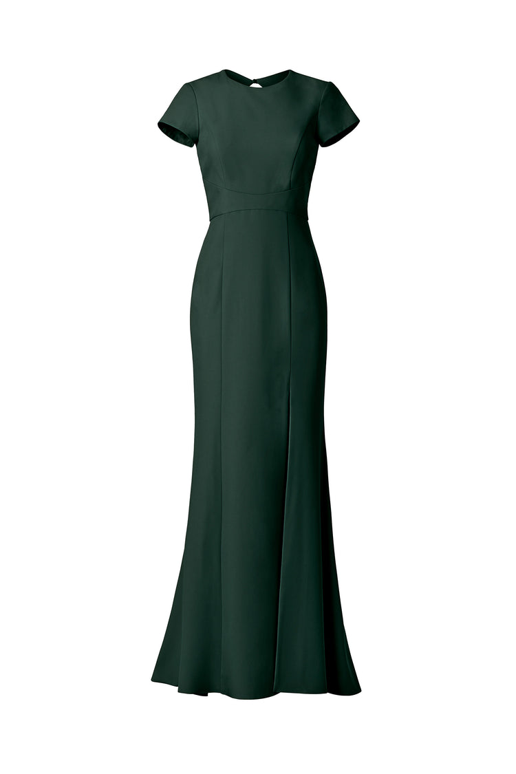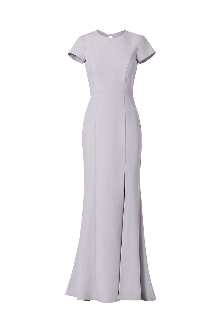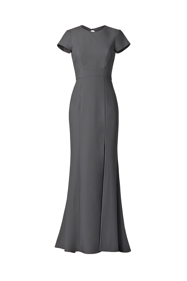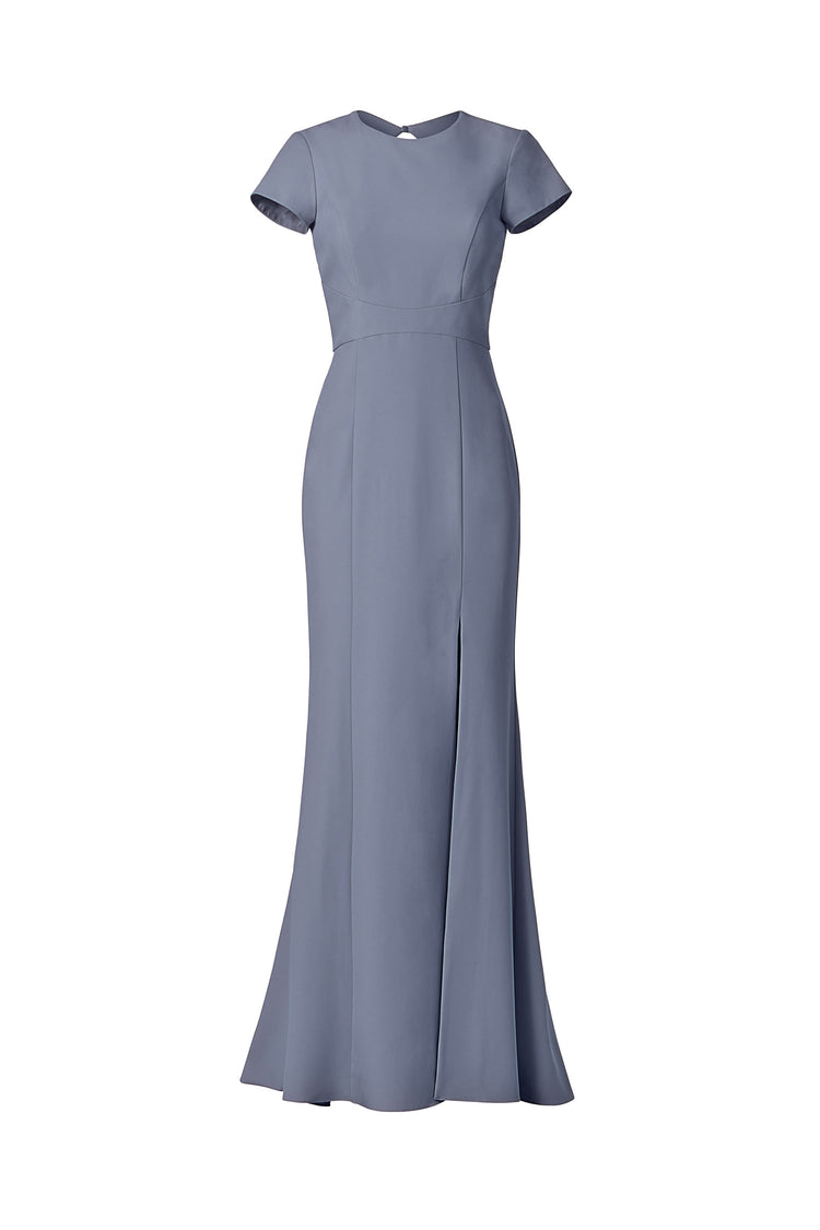 High neck tee shirt bodice with keyhole back and slit, fit to flare dress in crepe.