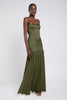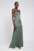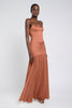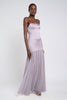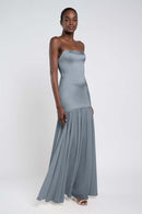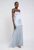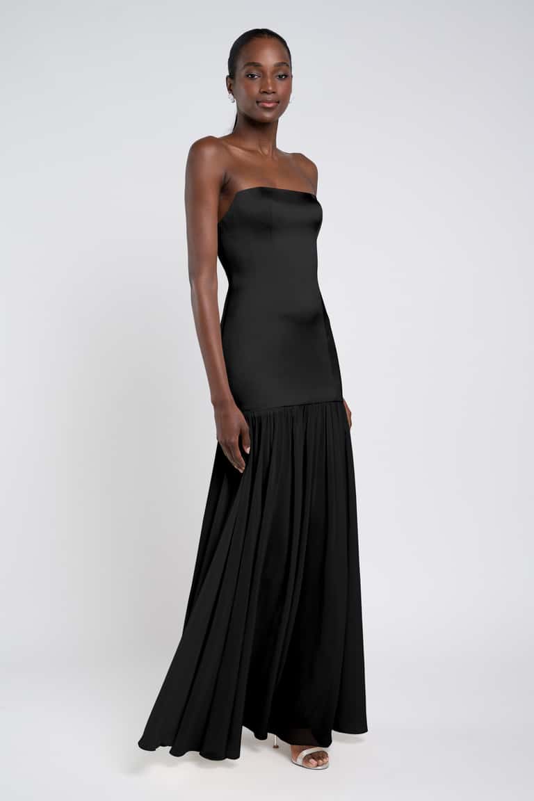 The Celia dress features a clean strapless neckline with a structured satin mini dress cut in our lustrous luxe satin, and a contrast flowing chiffon skirt.