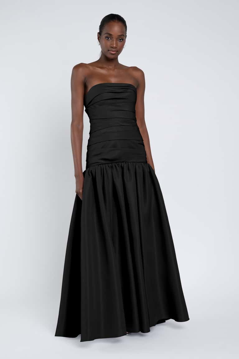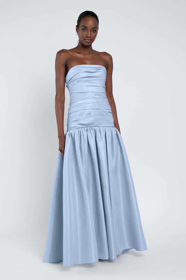 The Sarah dress, cut in our new light taffeta fabric, features a dramatic mermaid silhouette with a structured bodice with pleat details.