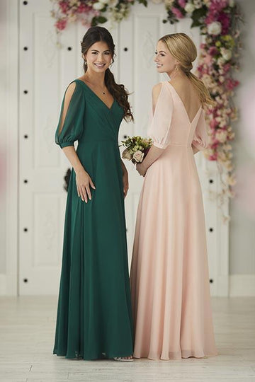 Traditionally, bridesmaids wear dresses! They can be short or long, knee length or midi, and they can be any color, fabric, and silhouette you like. Bridesmaid dresses have long been the wedding standard, but bridesmaid jumpsuits are a chic and modern option as well!