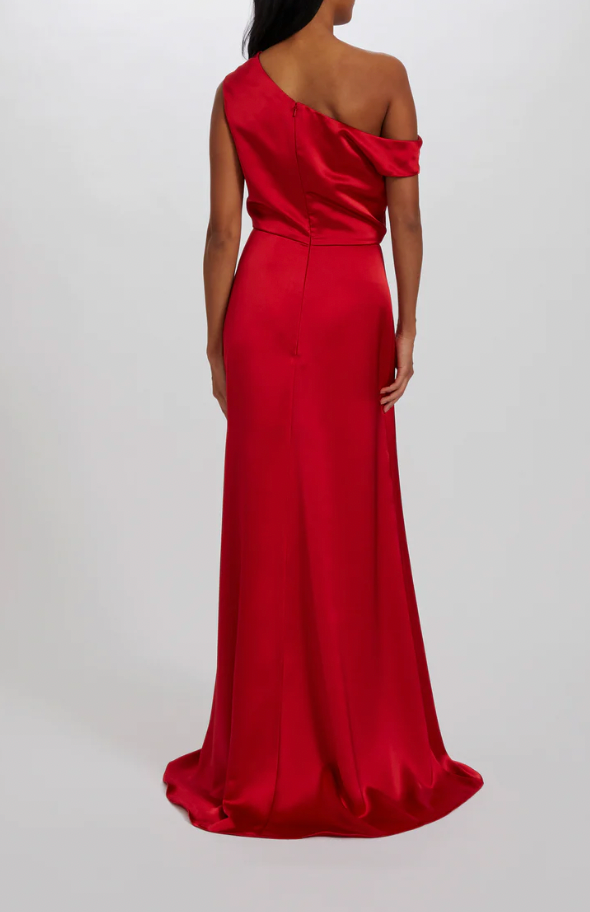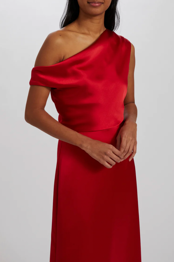 Cut in our fluid satin, the Alden dress features a draped, off-the-shoulder neckline with an elegant A-line skirt.