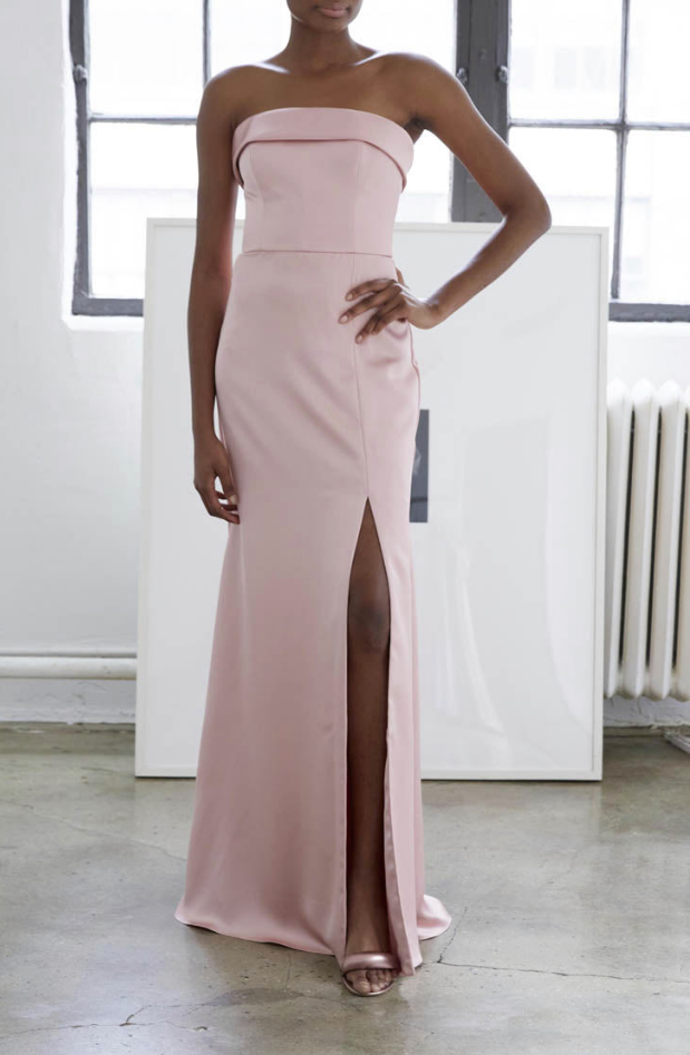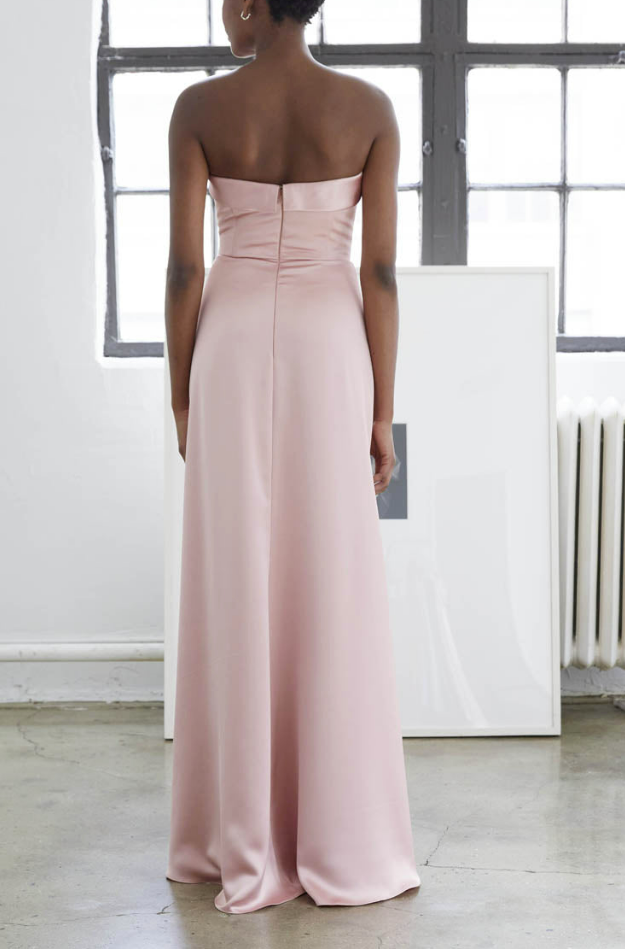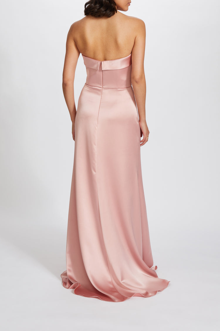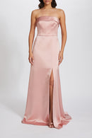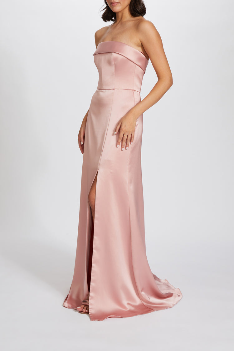 The Alora gown features an elegant and classic strapless silhouette with a fold over band, a natural waist and a sultry skirt slit in our Fluid Satin.
