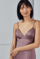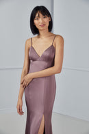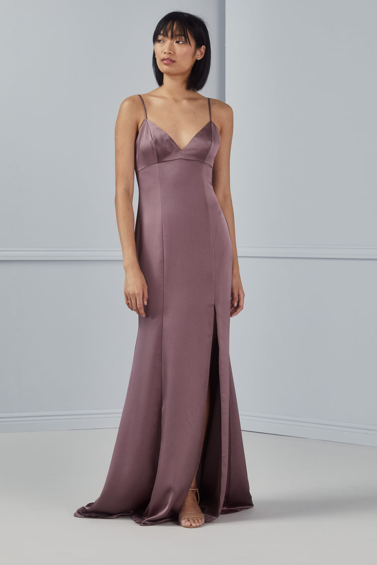 The Briar slip dress in Fluid Satin boasts delicate spaghetti straps, a feminine bralette-style top with a V-neckline and an empire silhouette with seams extending to the hem to give the illusion of an elongated body. The skirt features an alluring slit making this dress chic and elegant.
