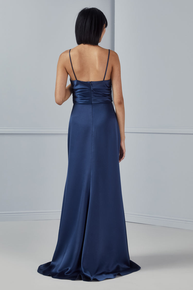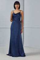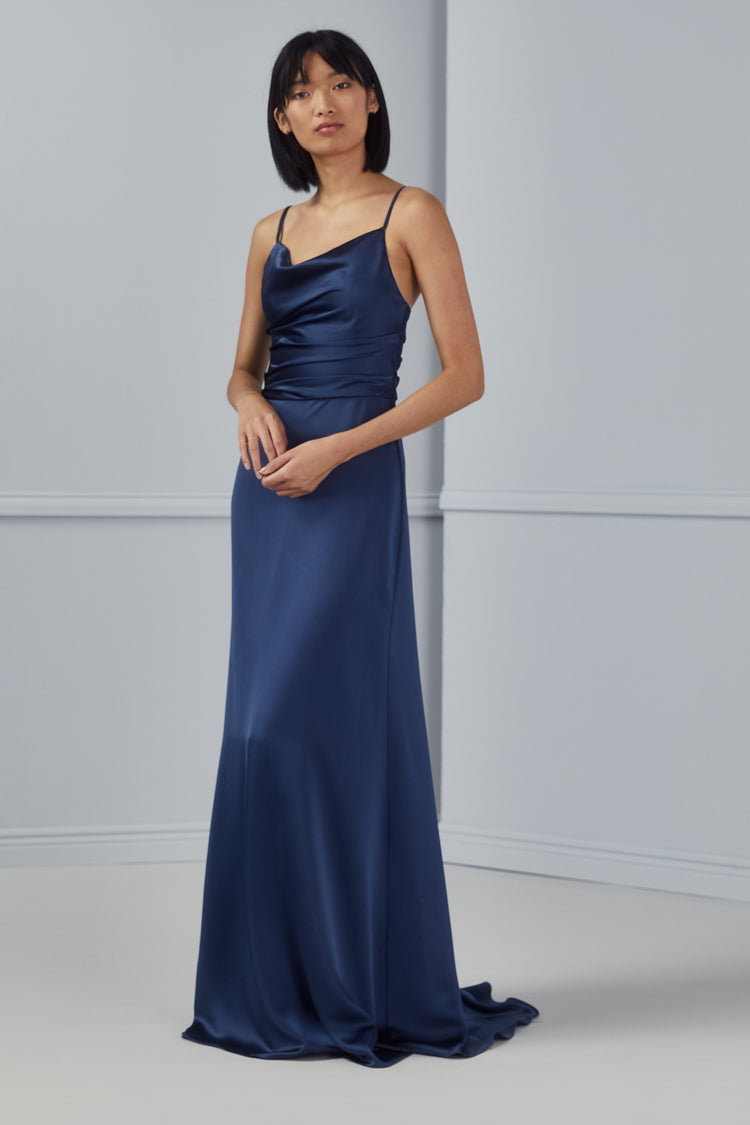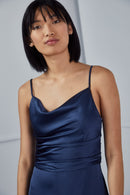 The Cody dress features a cowl neckline along with a gathered bodice, dainty spaghetti straps and a slim A-line skirt cut in our dreamy fluid satin fabric. This dress is both feminine and chic, making it a versatile choice for any event.