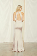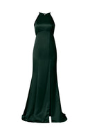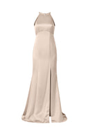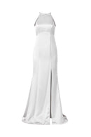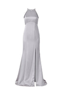 High neckline with deep keyhole back, fit-to-flare dress in fluid satin.