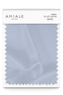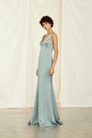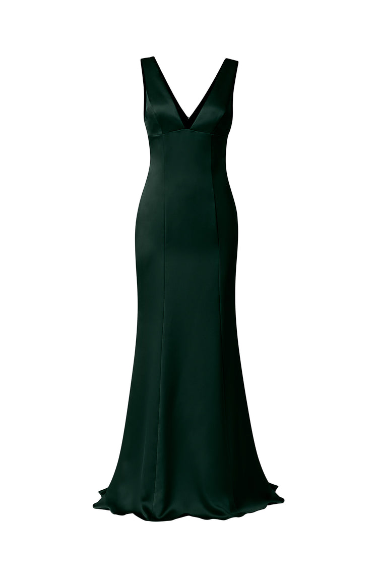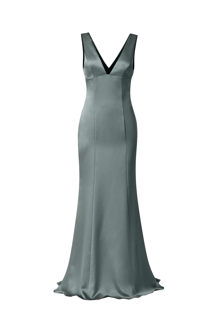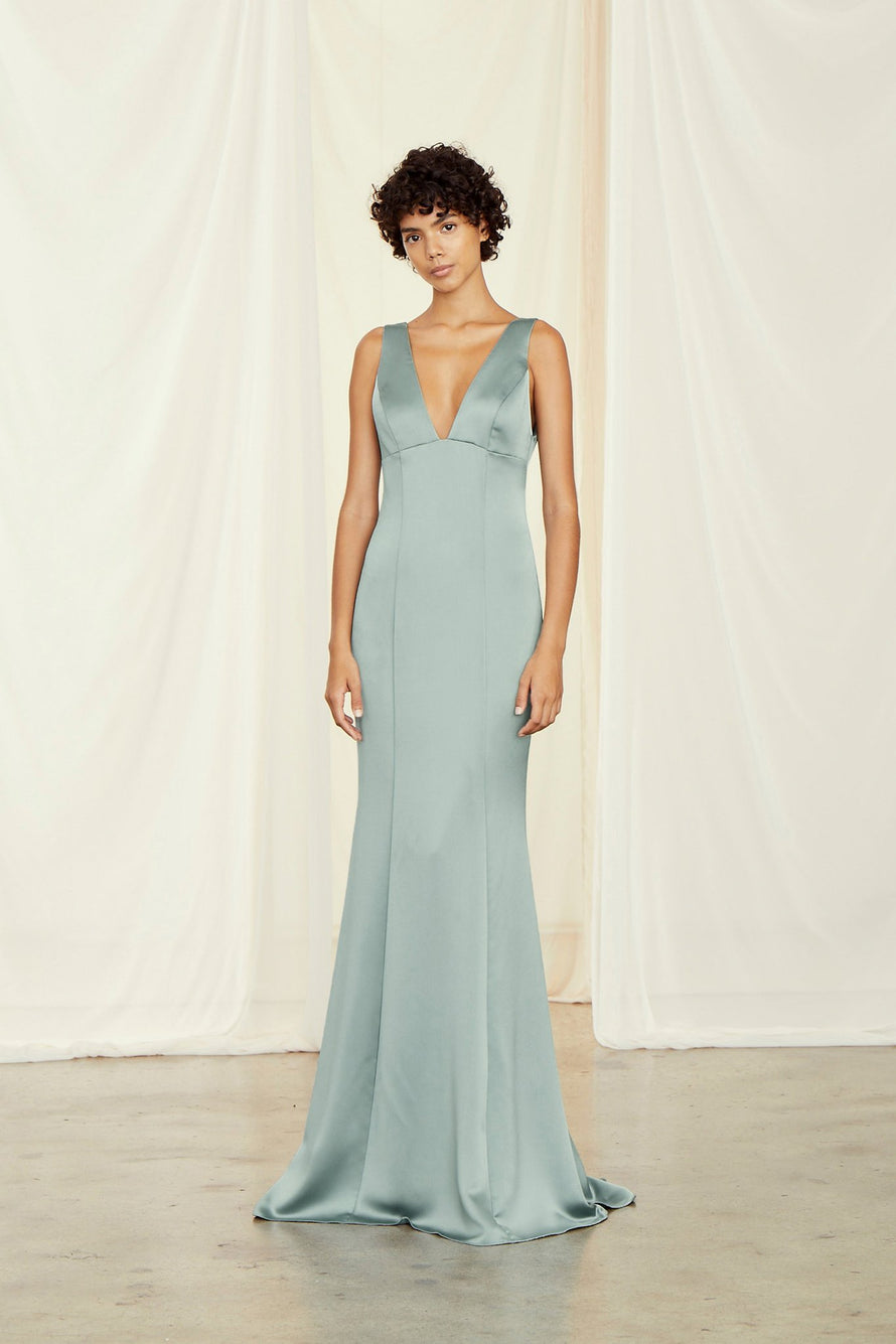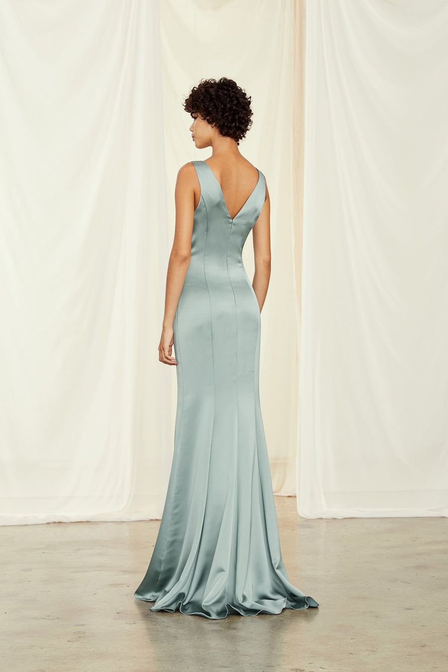 Deep V bridesmaids dress with empire bodice and V back in fluid satin.