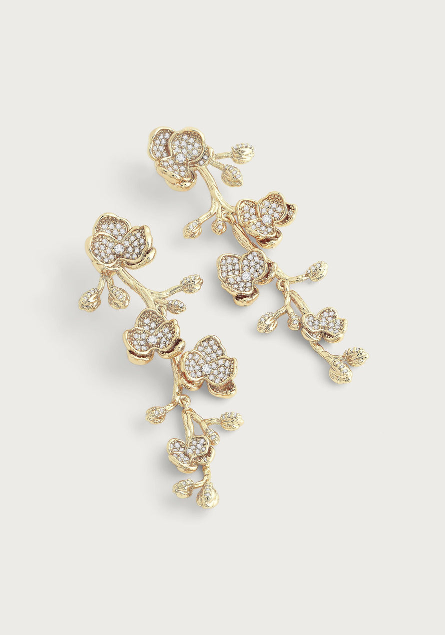 These delicate dangle earrings are crafted from 18k gold-dipped brass and embellished with hand-set crystals. Their stems contain multiple hinges, enabling the crystal pave flowers – a mix of fuchsia and pale pink crystals – to swing and sparkle as they catch the light.