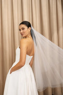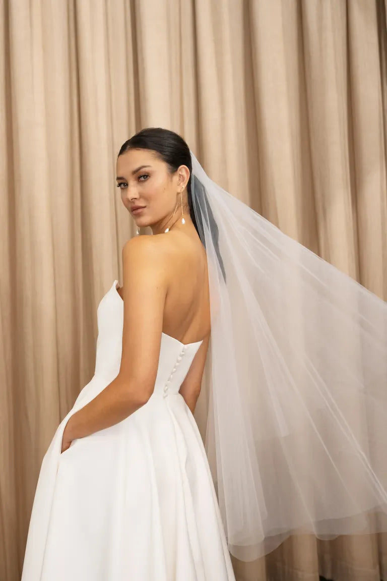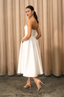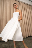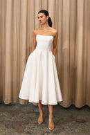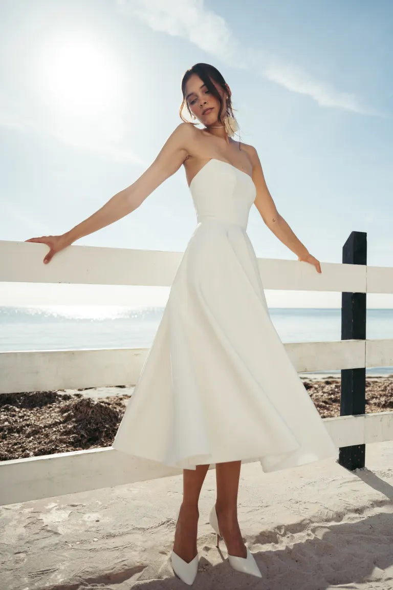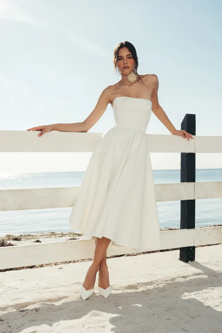 The Carrie dress is a chic and timeless option for all of your bridal events. Featuring an endlessly flattering corseted strapless bodice, and a full circle skirt made for twirling.