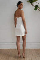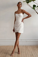 The Tatiana dress is a sleek and stylish mini dress featuring a flattering scoop neck that accentuates the décolletage, while its angled pleats draw attention to the waist. With the tulip skirt and mini length, this dress is designed to draw attention to the legs.