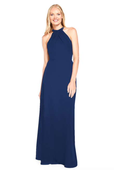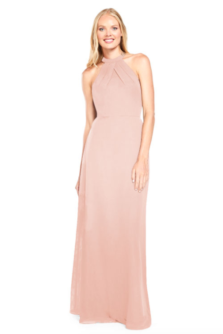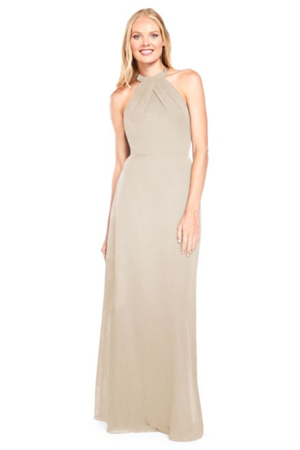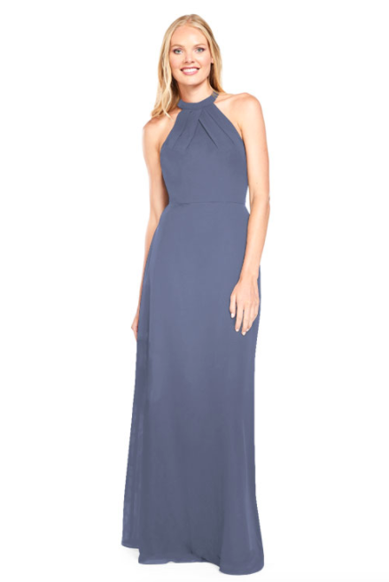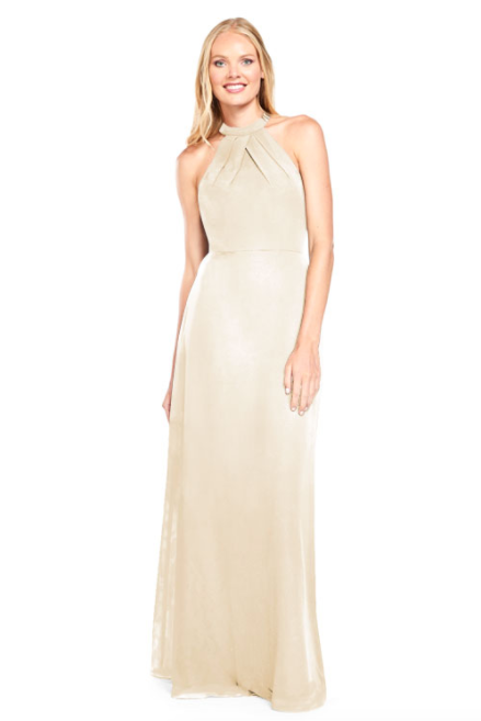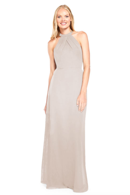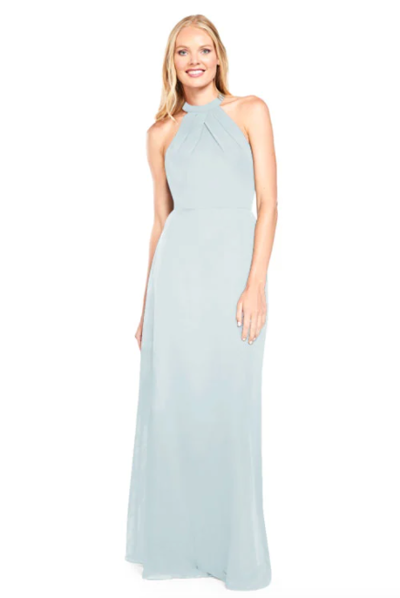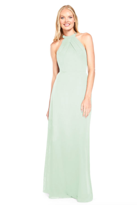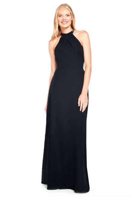 Pleated halter bodice with A-line skirt and sheer chiffon back panels on the back.