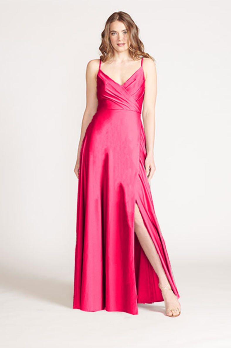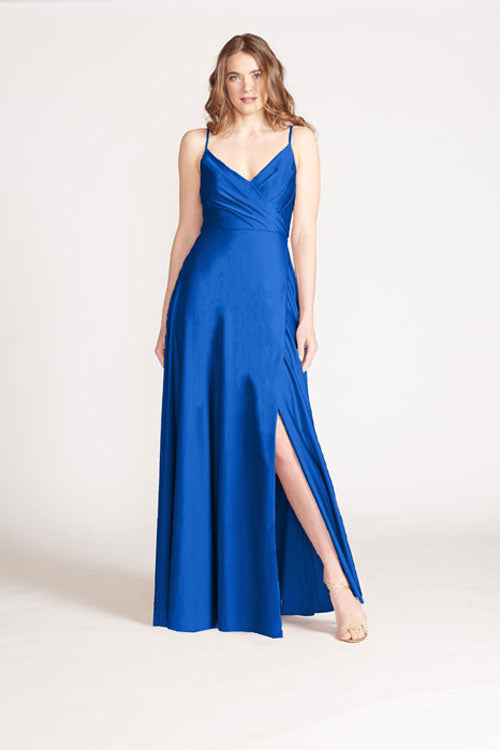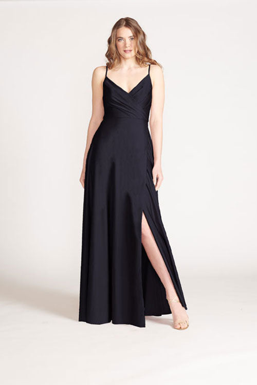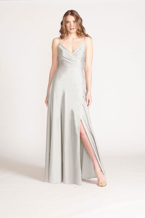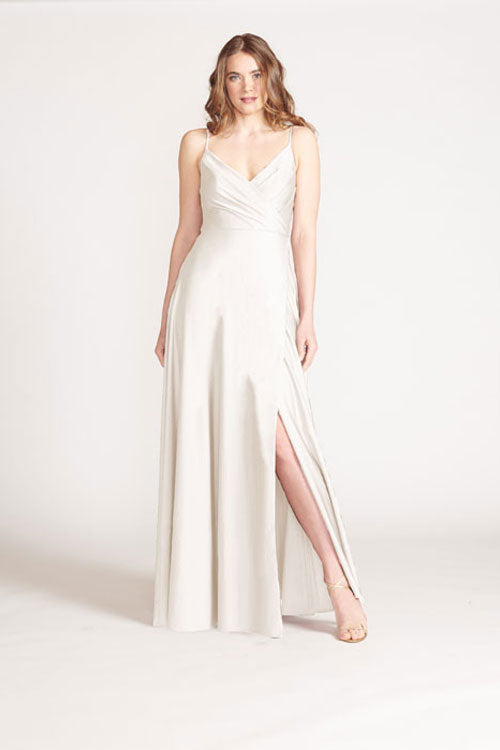 Draped v-neck bodice, with spaghetti straps and faux wrap ball gown skirt.