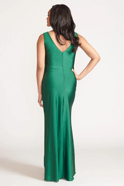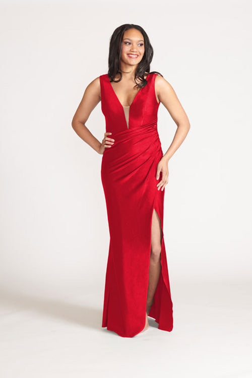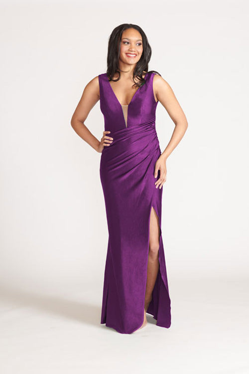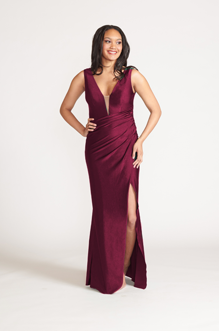 Illusion deep v-neck bodice with diagonal draped faux wrap skirt with slit.