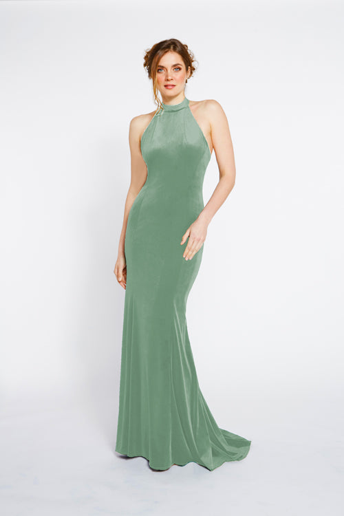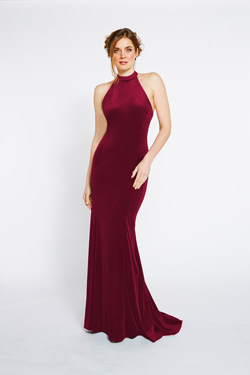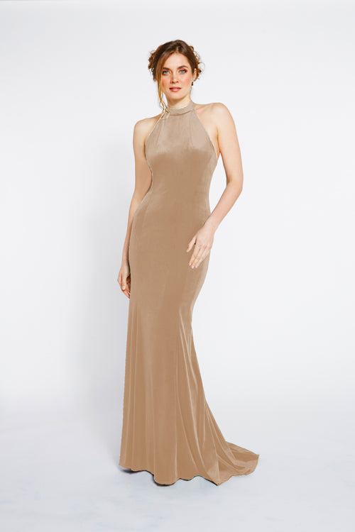 Bari Jay Bridesmaid Dress 2260. High neck halter dress with pleats and fit & flare skirt with slight train. The colors displayed on our website may vary from screen to screen and will differ from the actual fabric color.