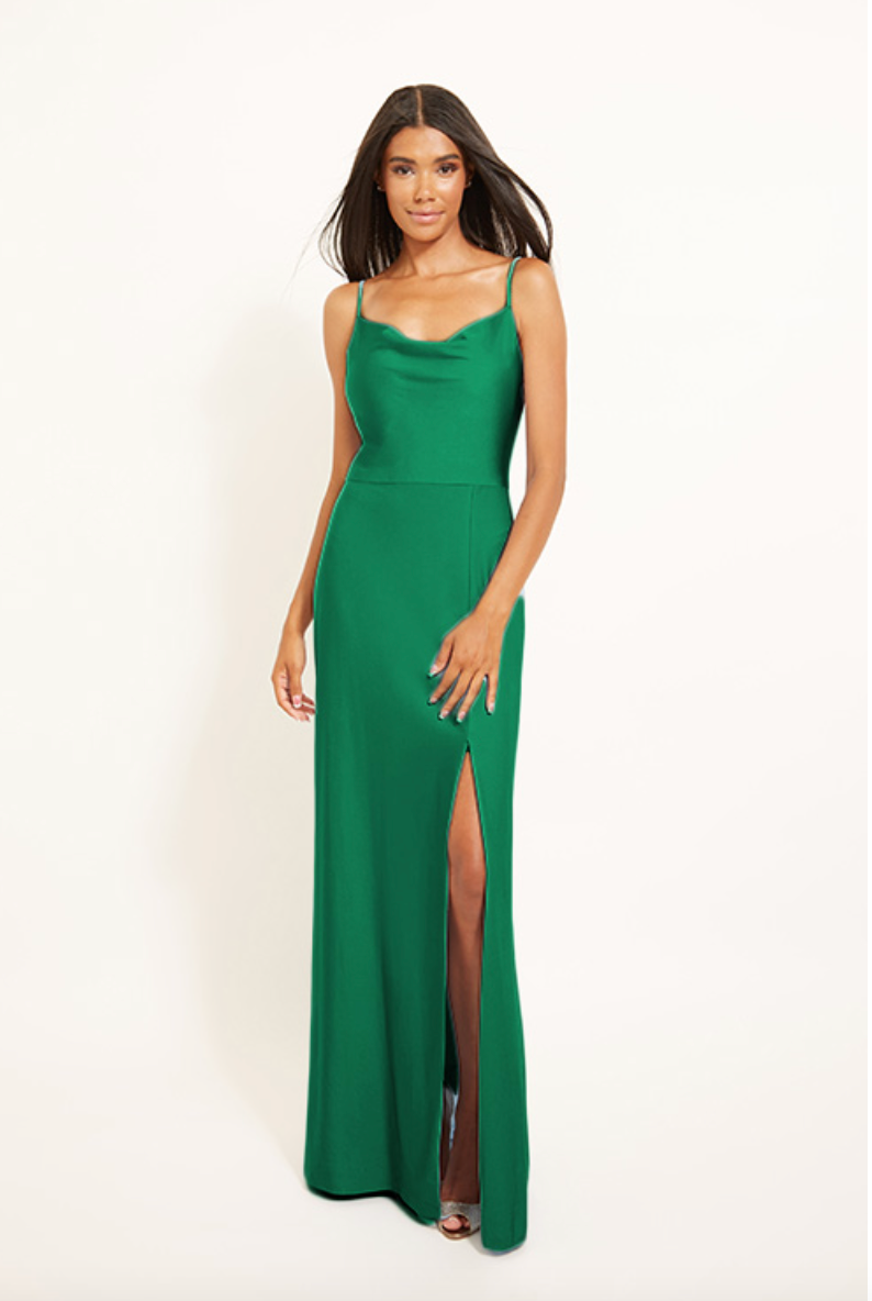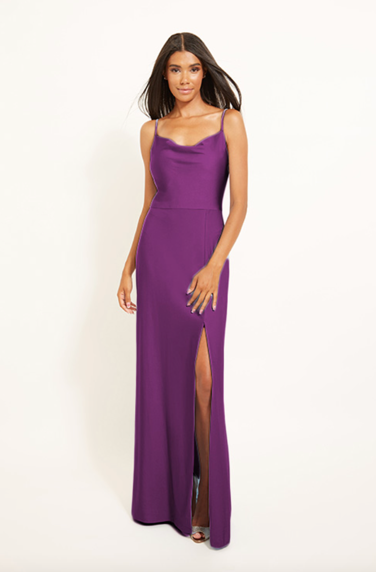 Lux stretch cowl neck dress with spaghetti straps. Straight skirt with a slit.