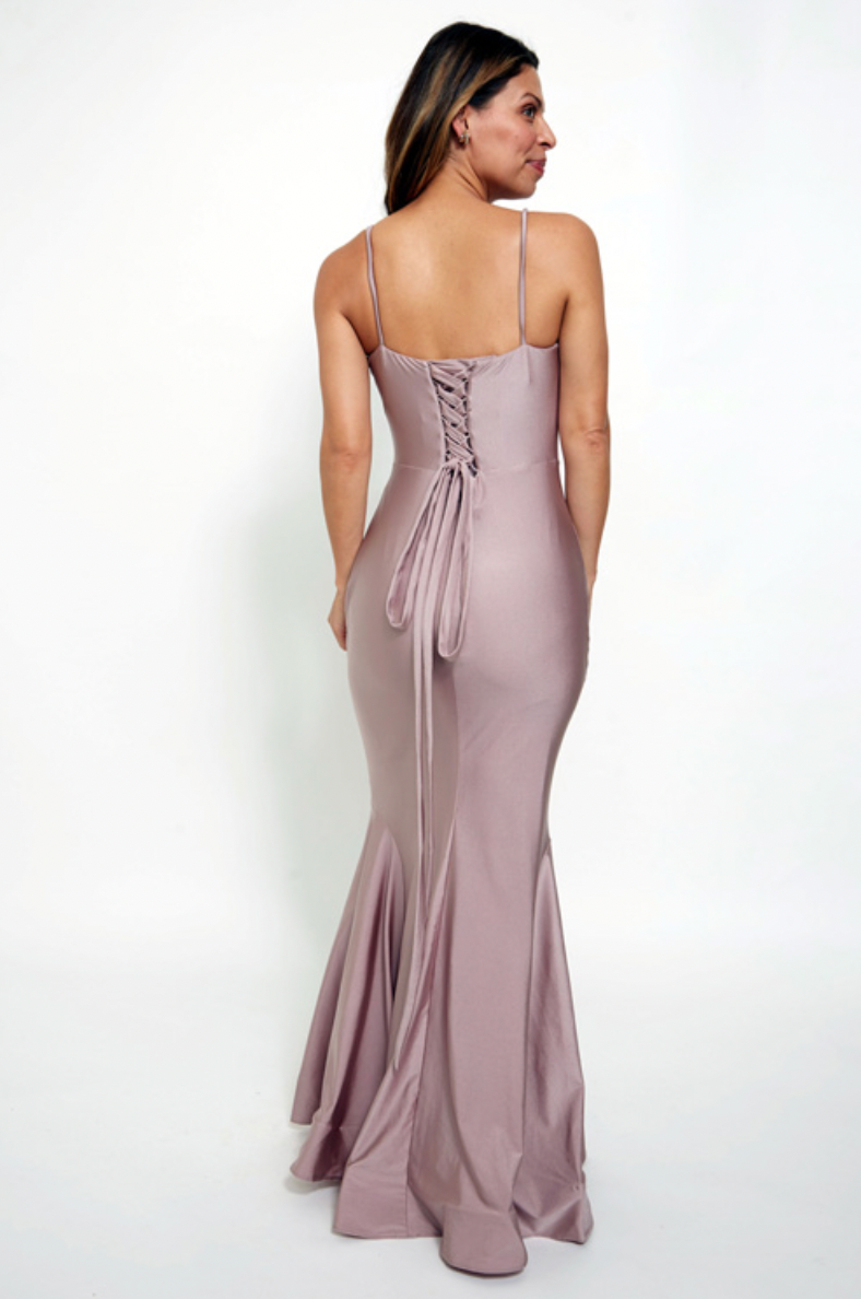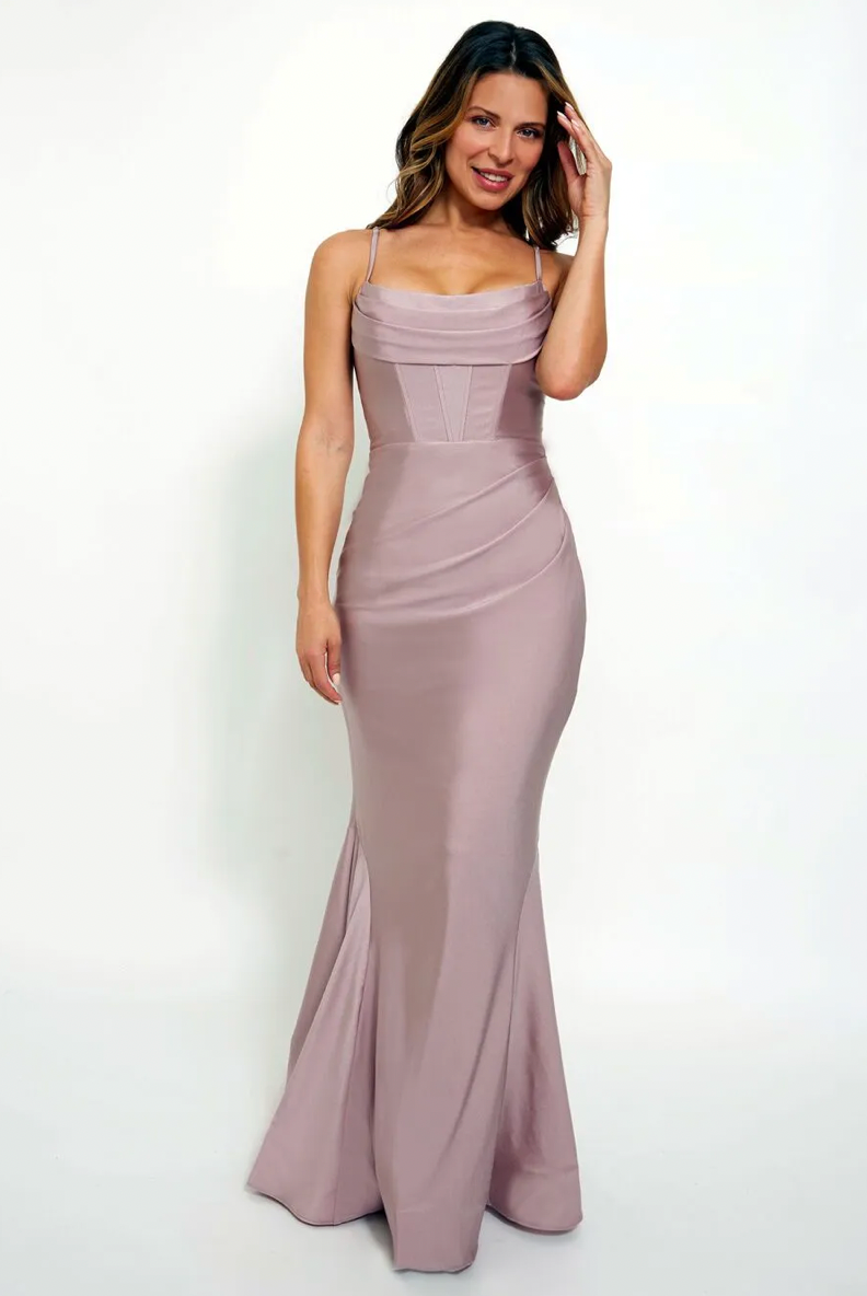Draped cowl neckline with corset bodice and lace-up back. Mermaid skirt with light gathering on hip.