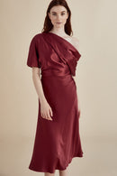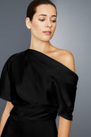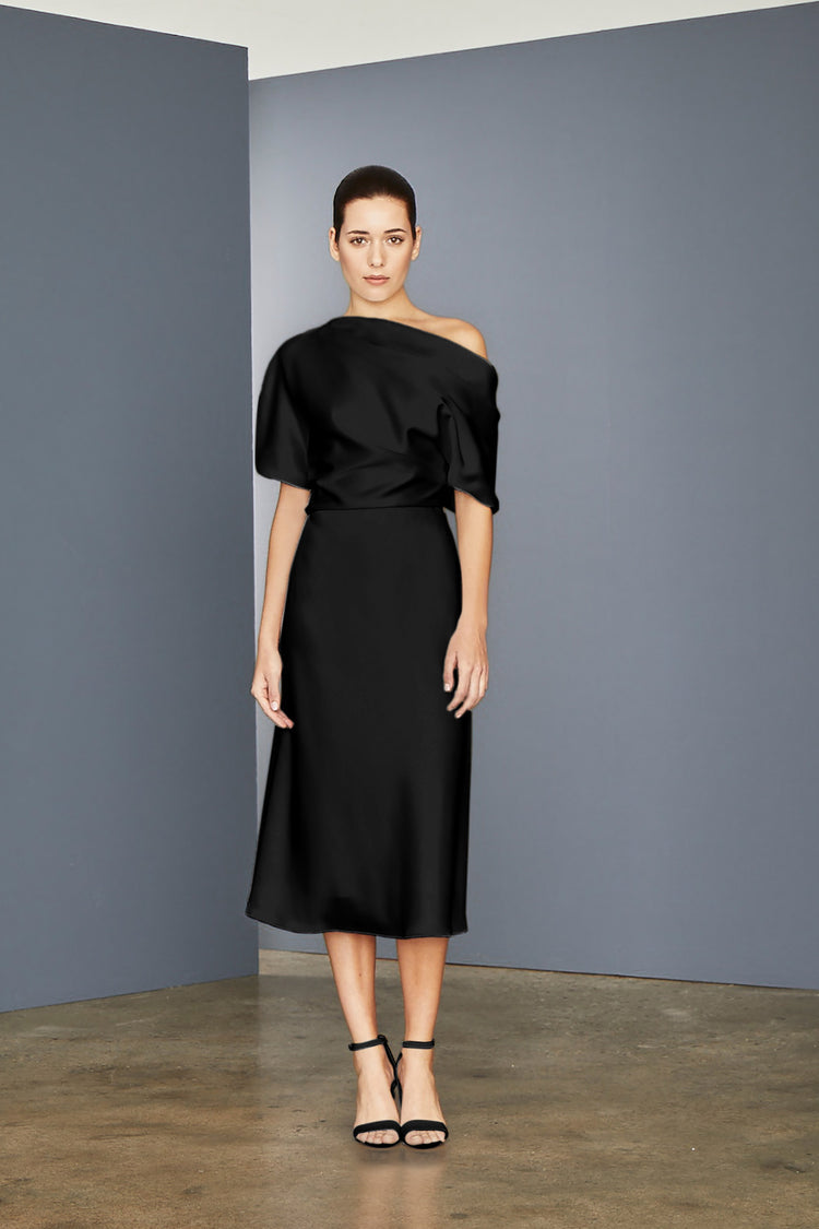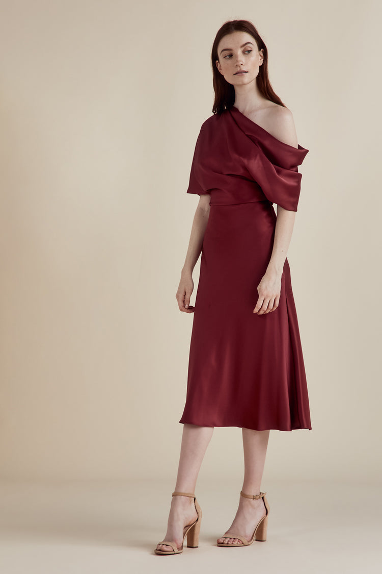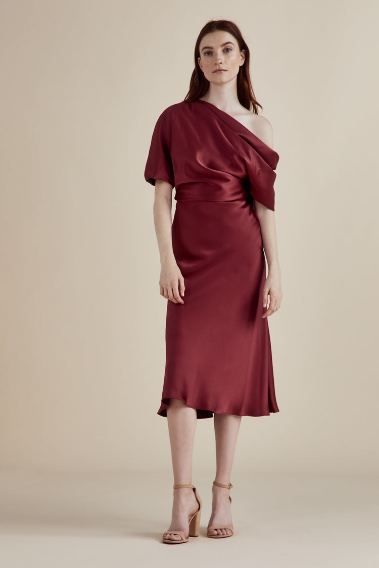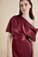 Fluid Satin one-shoulder draped bodice dress with bias skirt.