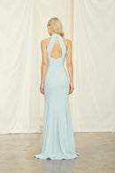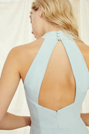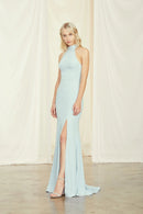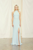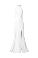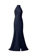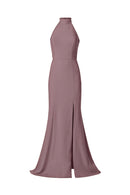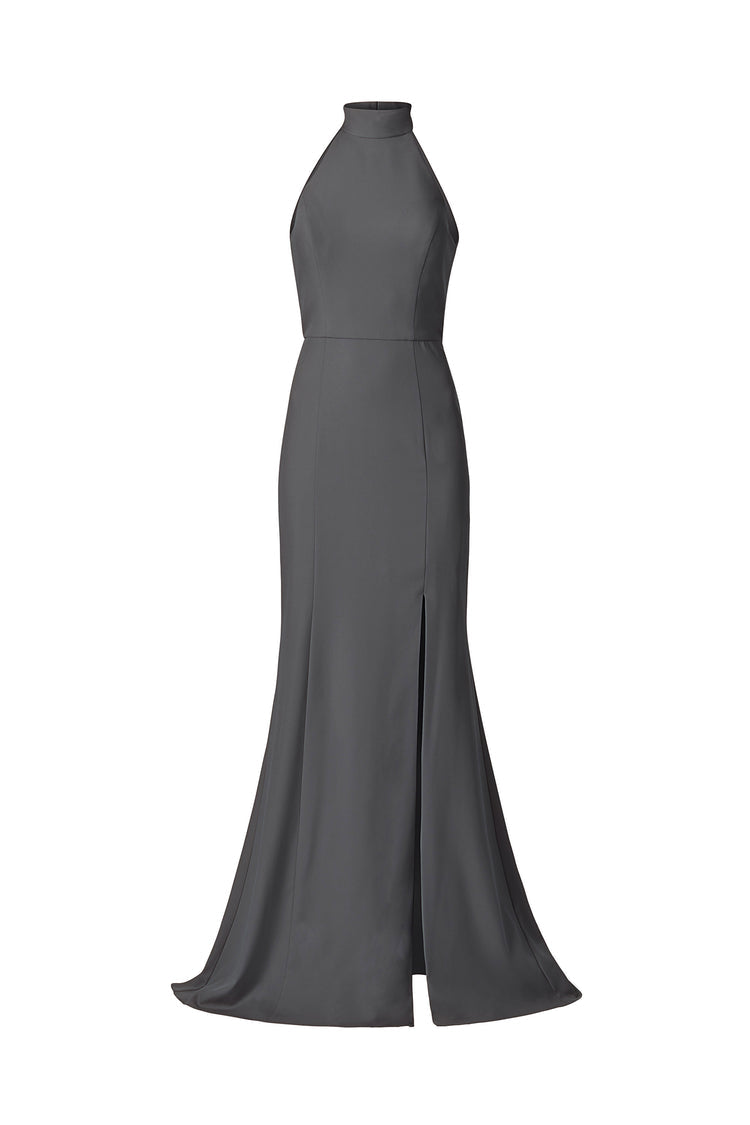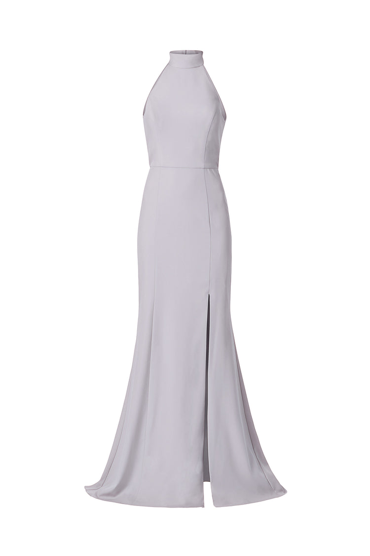 High neck with wide strap back, fit-to-flare dress with slit in crepe.