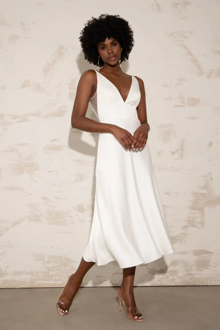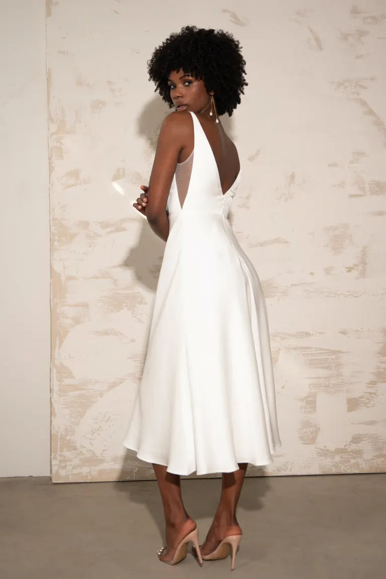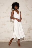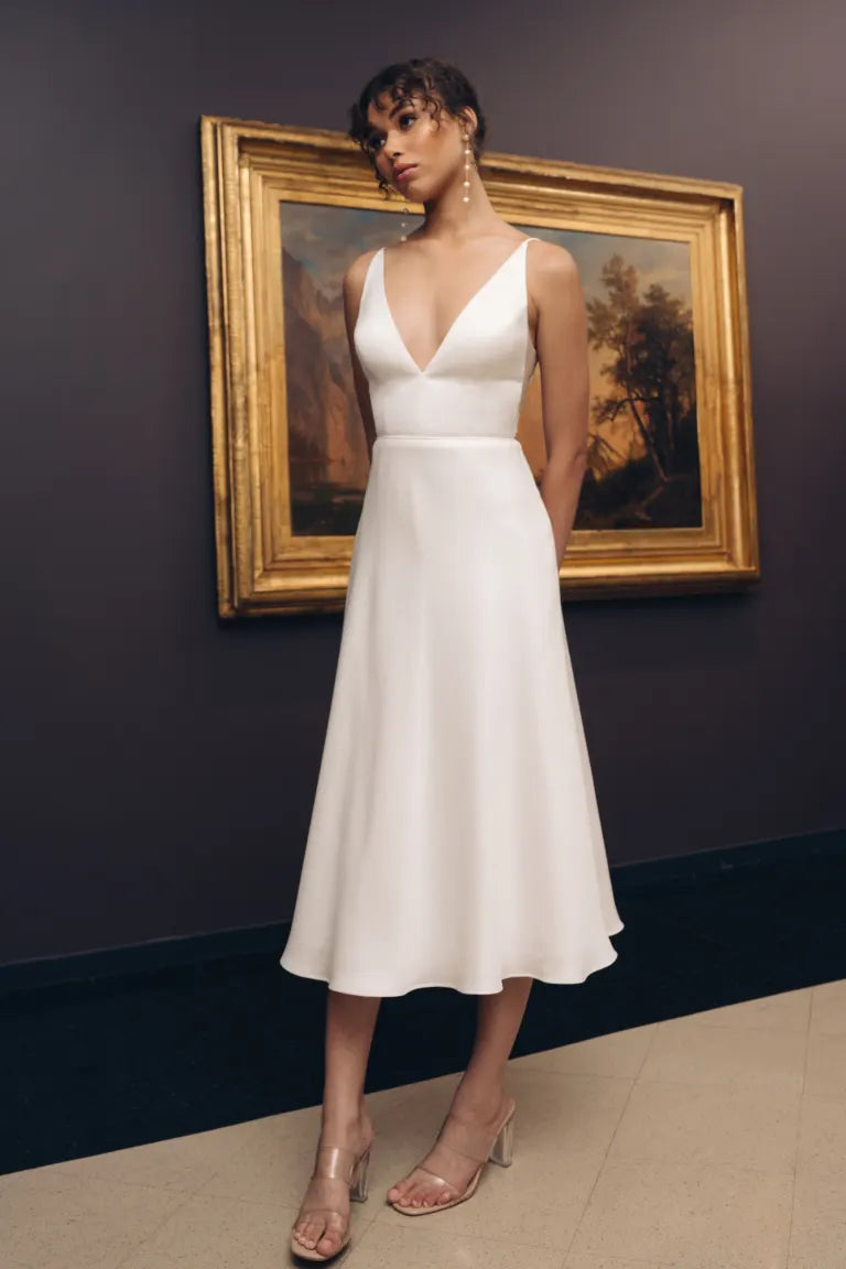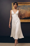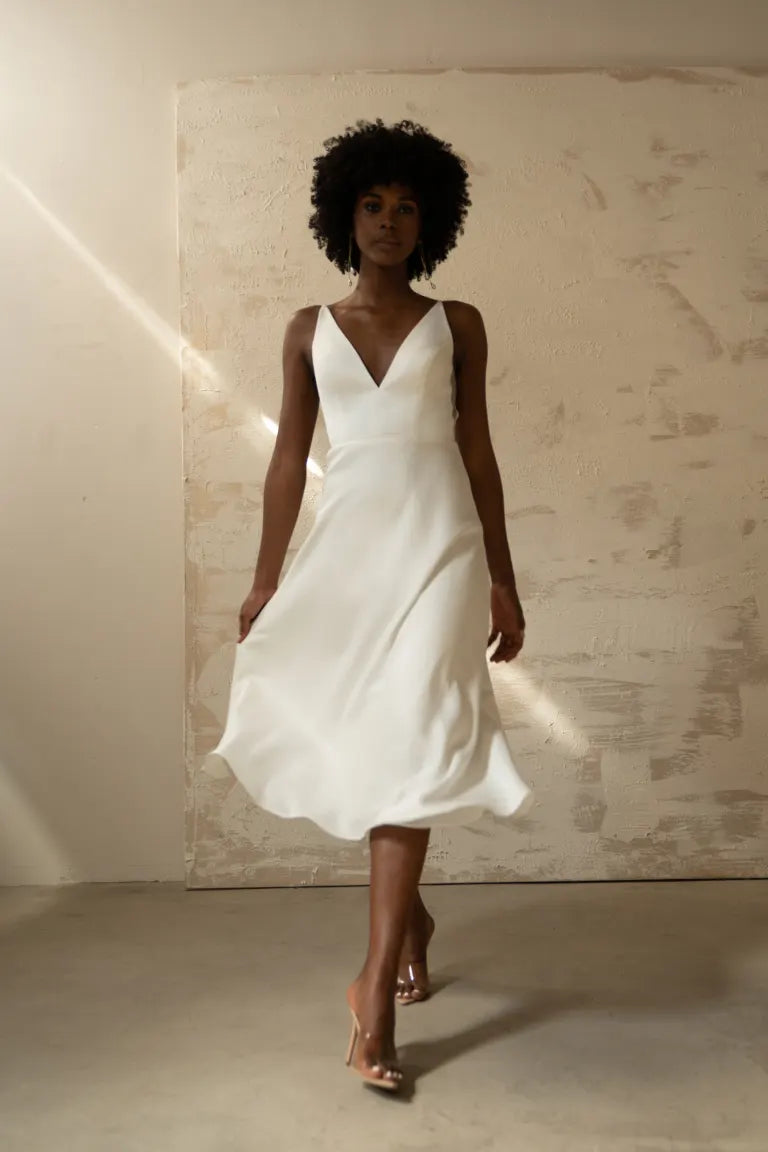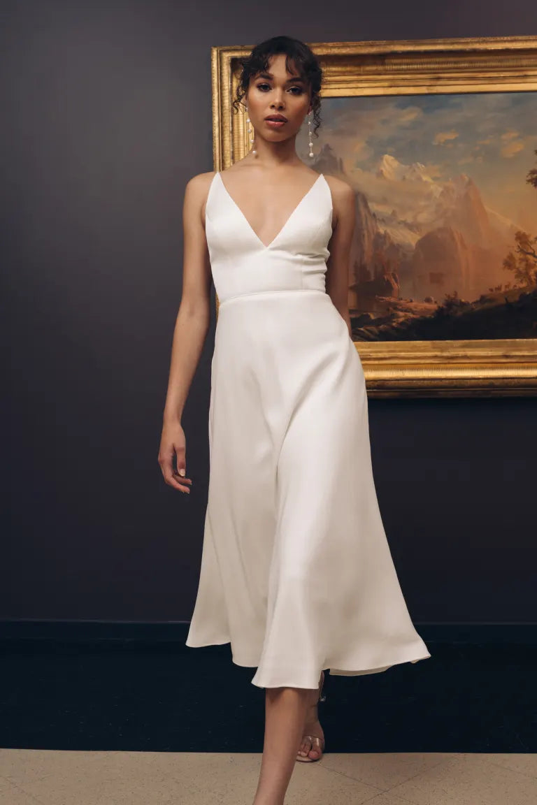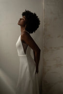 The Caroline dress embodies classic elegance. Crafted from our beautifully lustrous soft Mikado fabric, its fitted bodice and A-line skirt create a highly flattering silhouette. The addition of slim piping at the waist adds a polished touch, and the delicate spaghetti straps allow for easy customization.