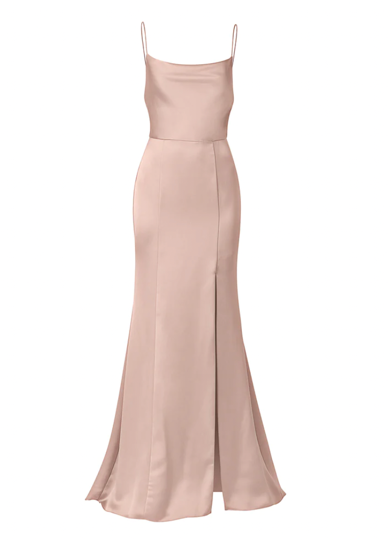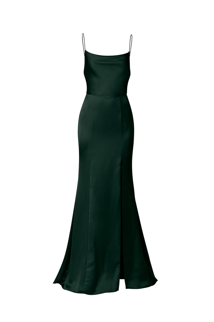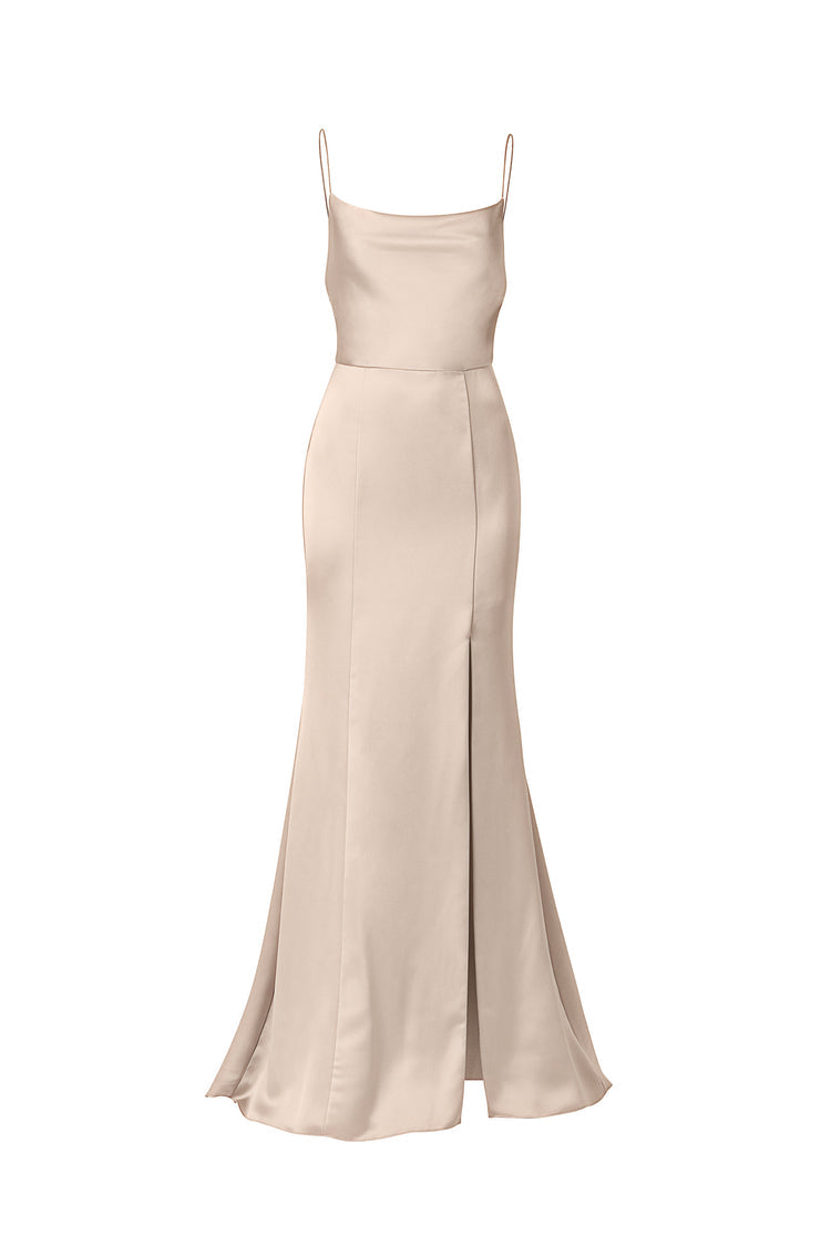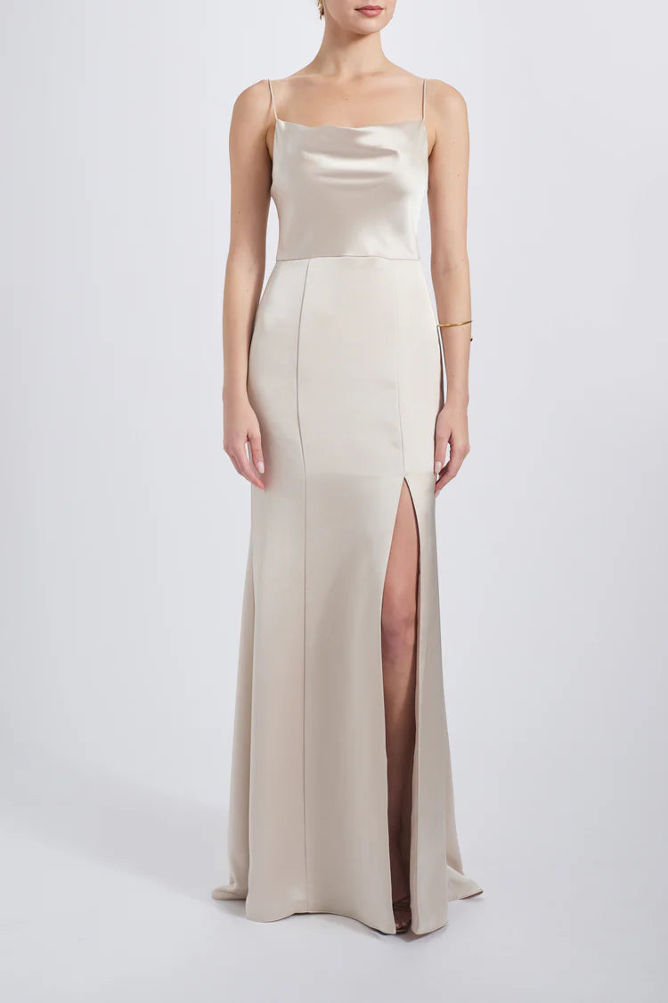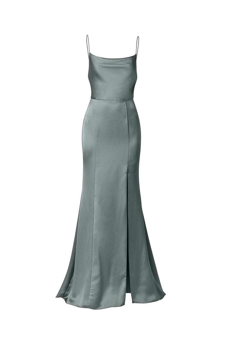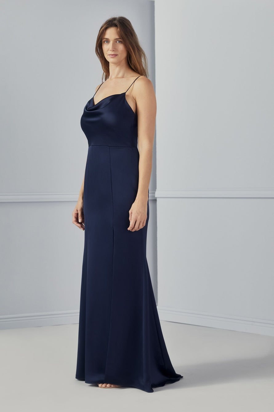 Drape neckline with low back, fit-to-flare dress with slit in fluid satin.