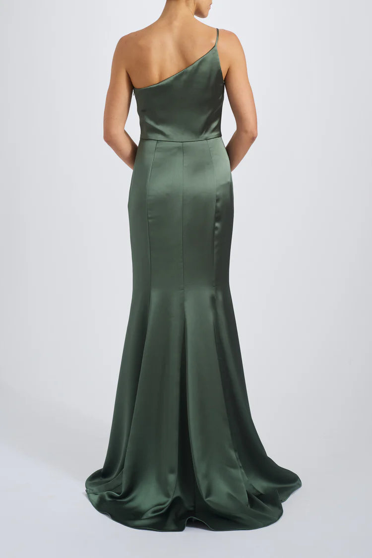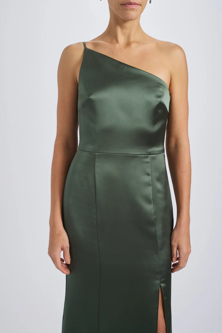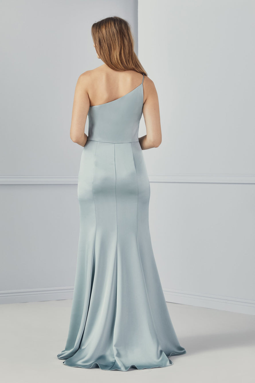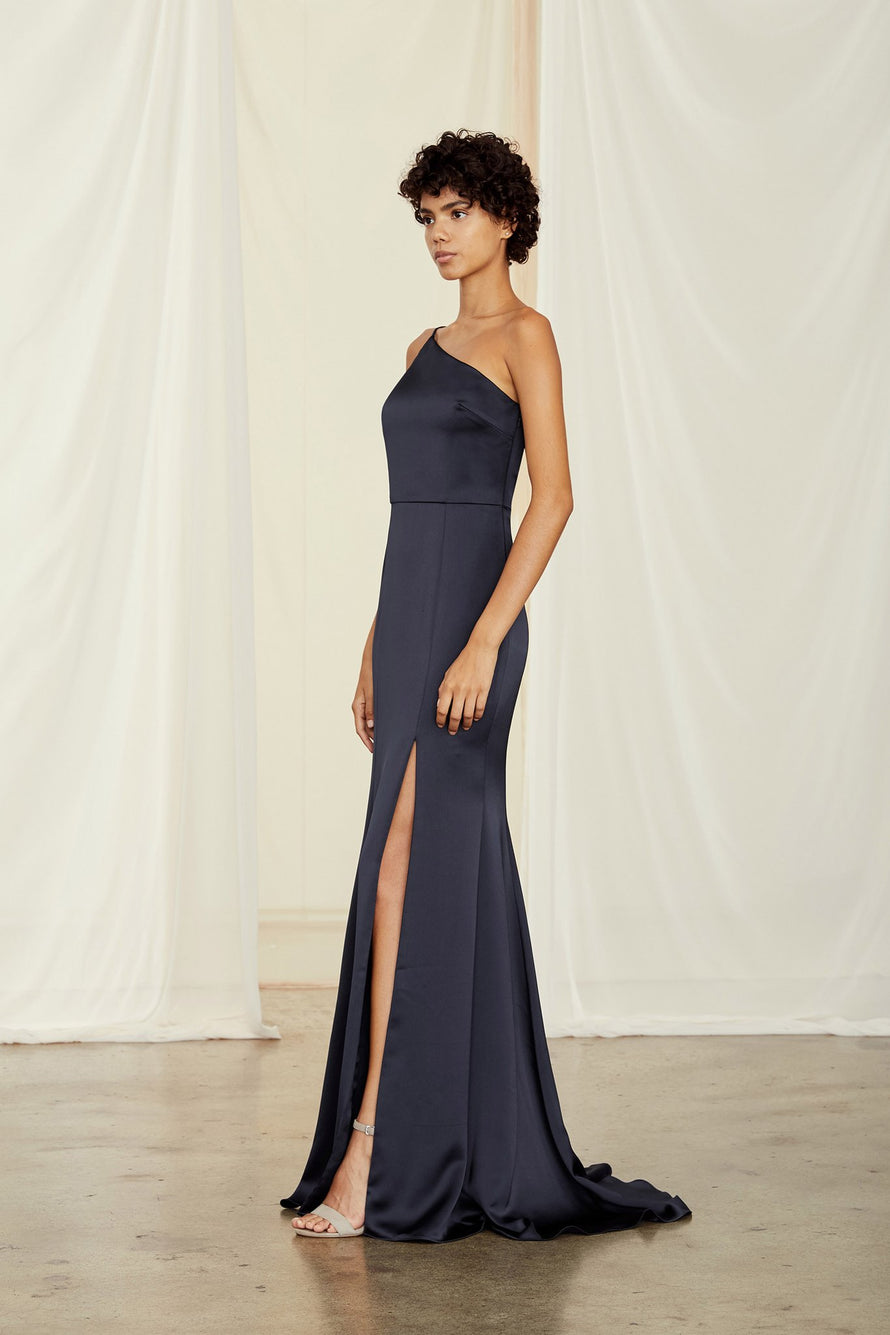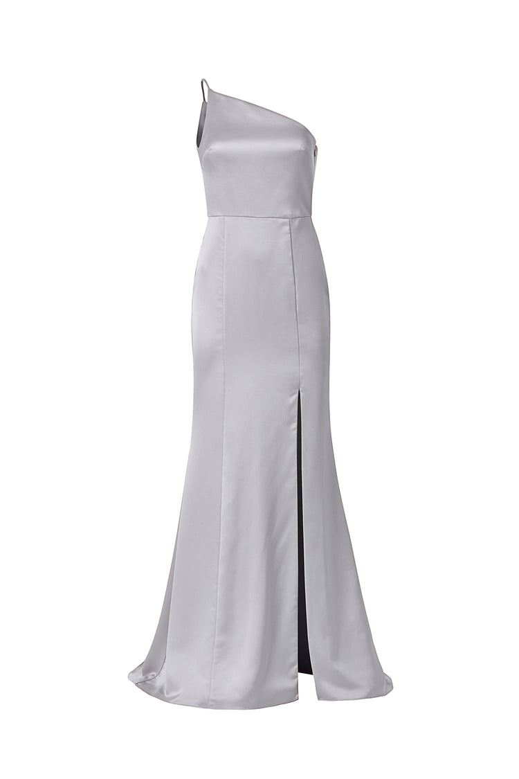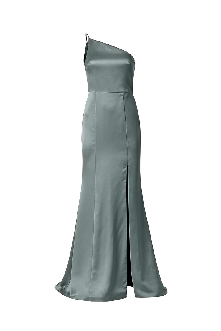 One-shoulder spaghetti strap dress with slit in fluid satin.
