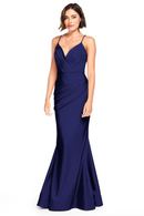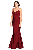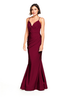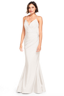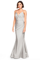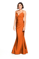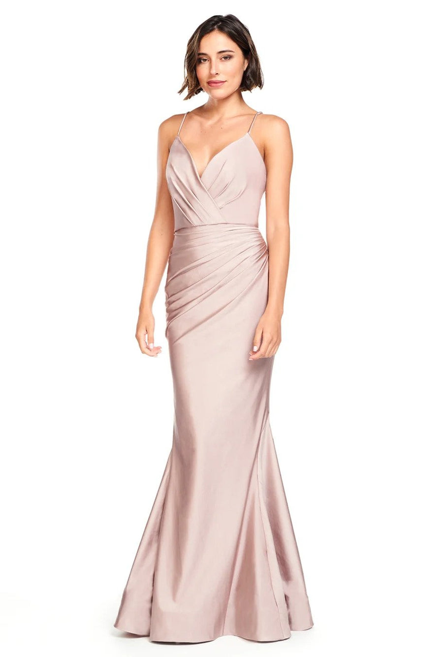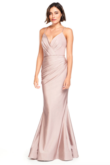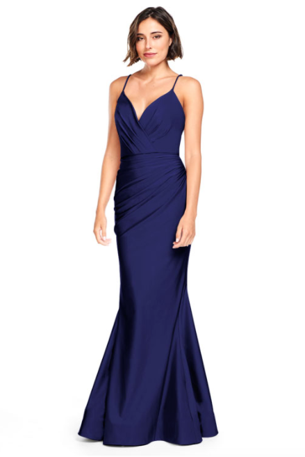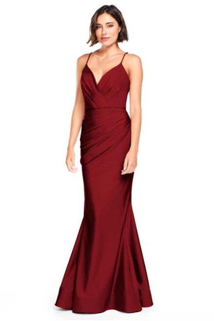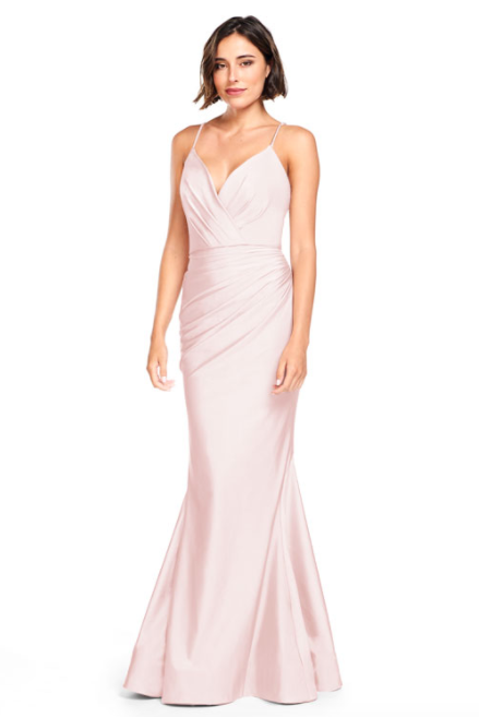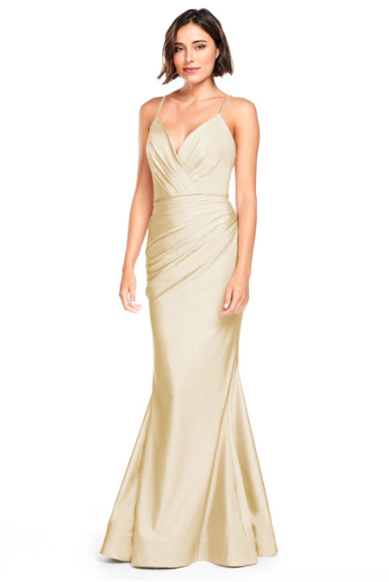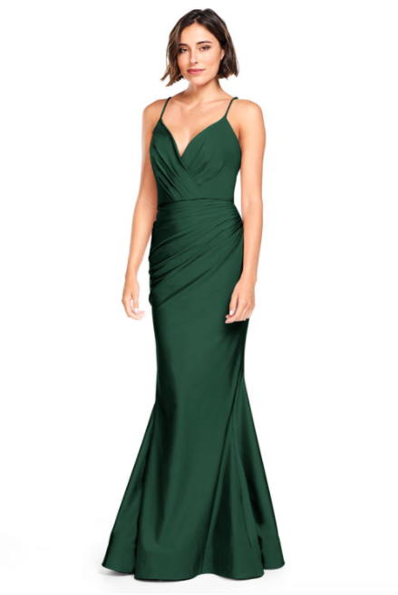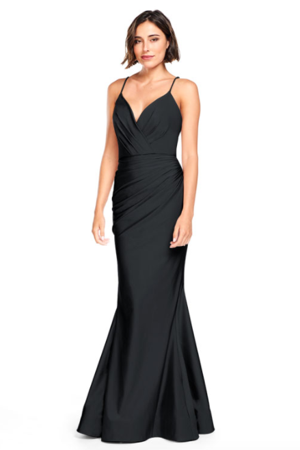 Bari Jay Bridesmaid Dress 2000 - Spaghetti strap overlapping V-neck ruched bodice with diagonal pleated skirt and horsehair hem. 4-way Stretch for an effortless fit. This style includes self knee length lining.