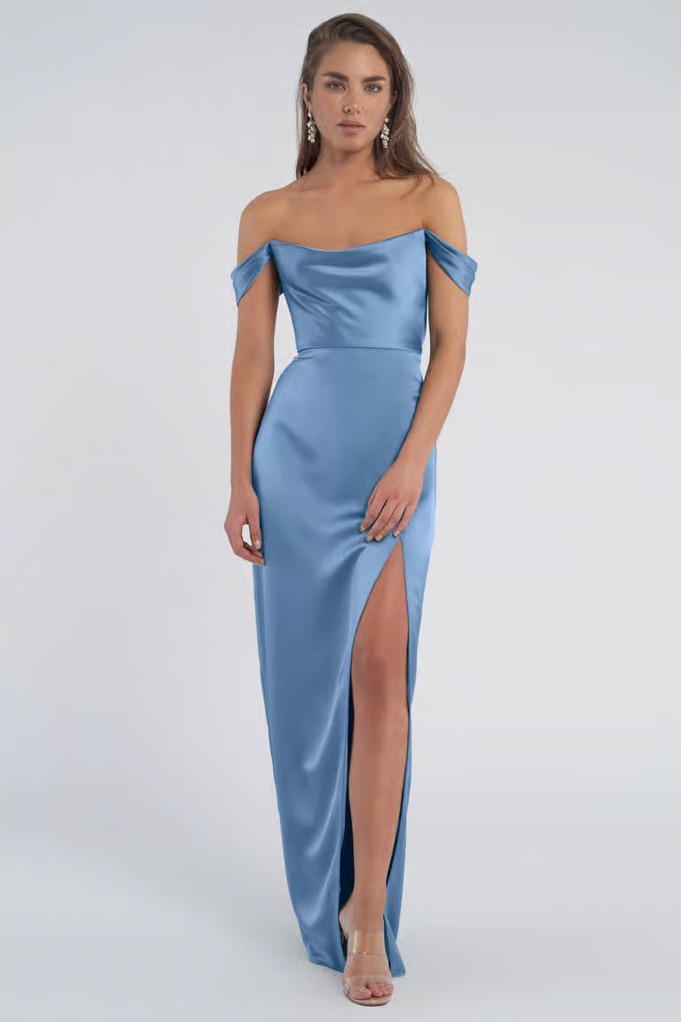 The Sawyer dress is made from our radiant luxe satin fabric and boasts gracefully draped off-the-shoulder sleeves, as well as a gentle cowl neckline. The bodice is structured with full boning and bust cups for support and a naturally flattering fit. Additionally, the slim pegged skirt showcases a stylish cutaway slit, offering a seductive glimpse of skin. This dress exudes glamour and elegance.