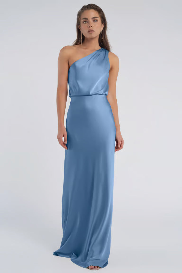 The Sterling dress, crafted from our lustrous luxe satin fabric, draws inspiration from the glamour of old Hollywood. With its sophisticated one-shoulder neckline adorned with pleats and a flattering blouson waist, this dress features a slinky bias-cut skirt that enhances your curves beautifully.