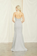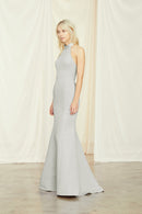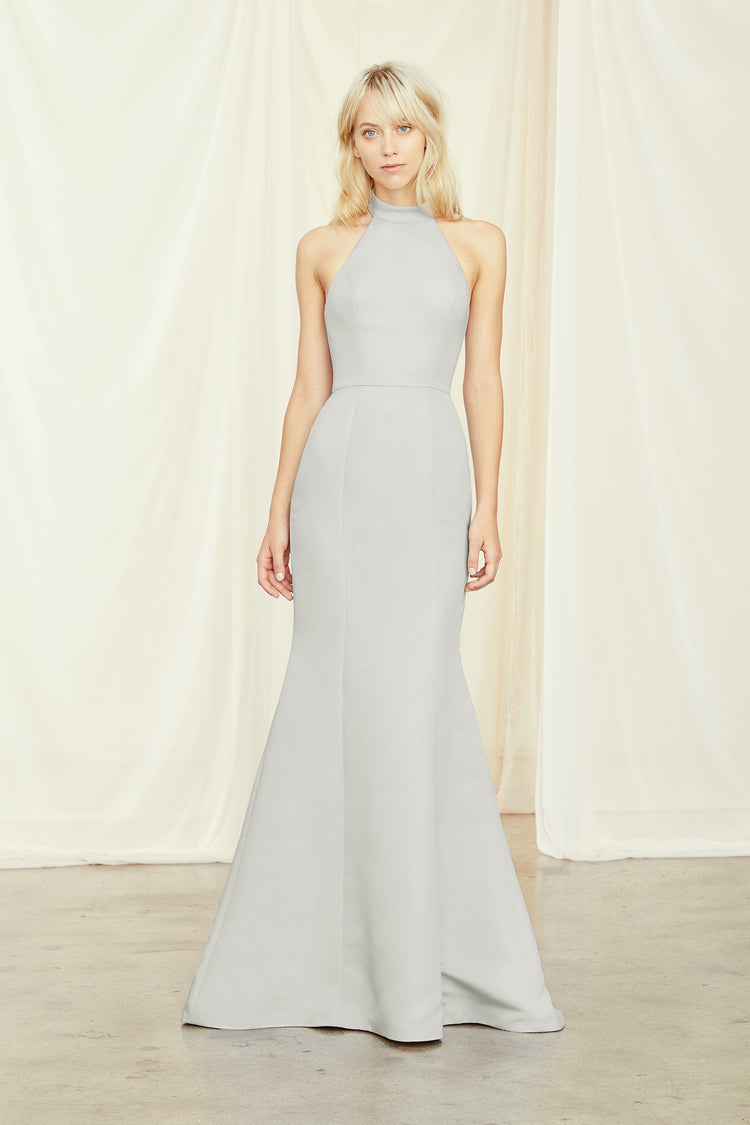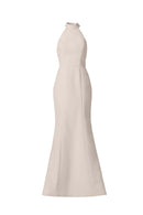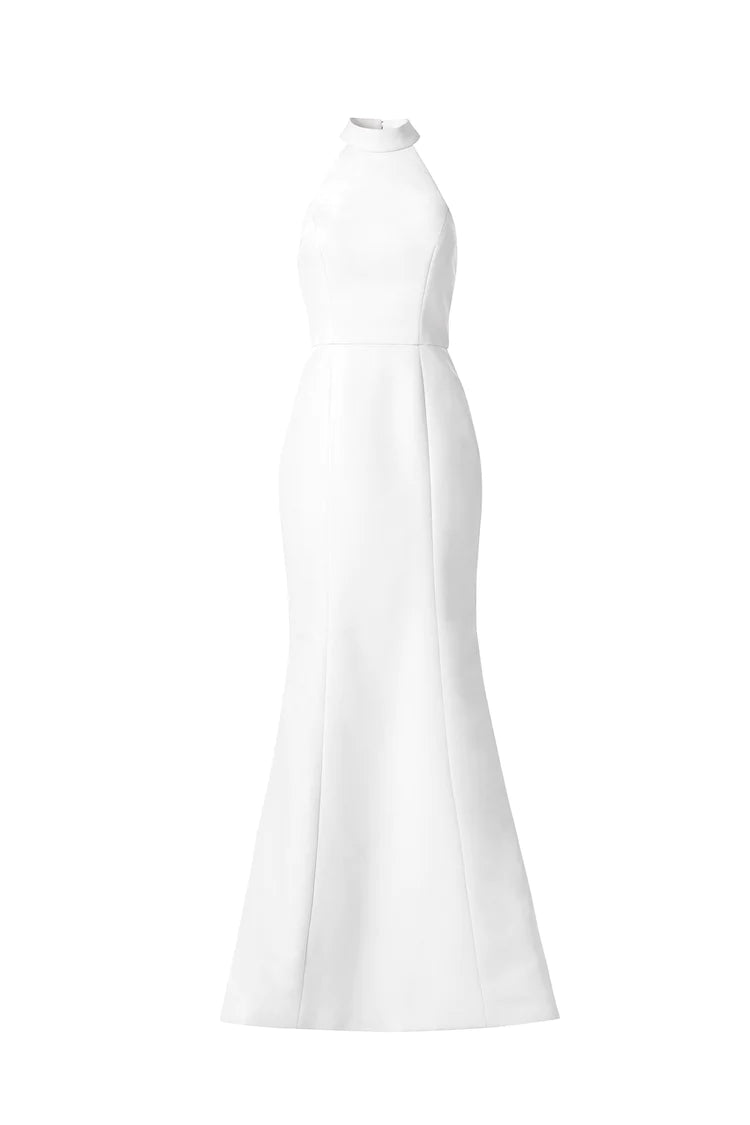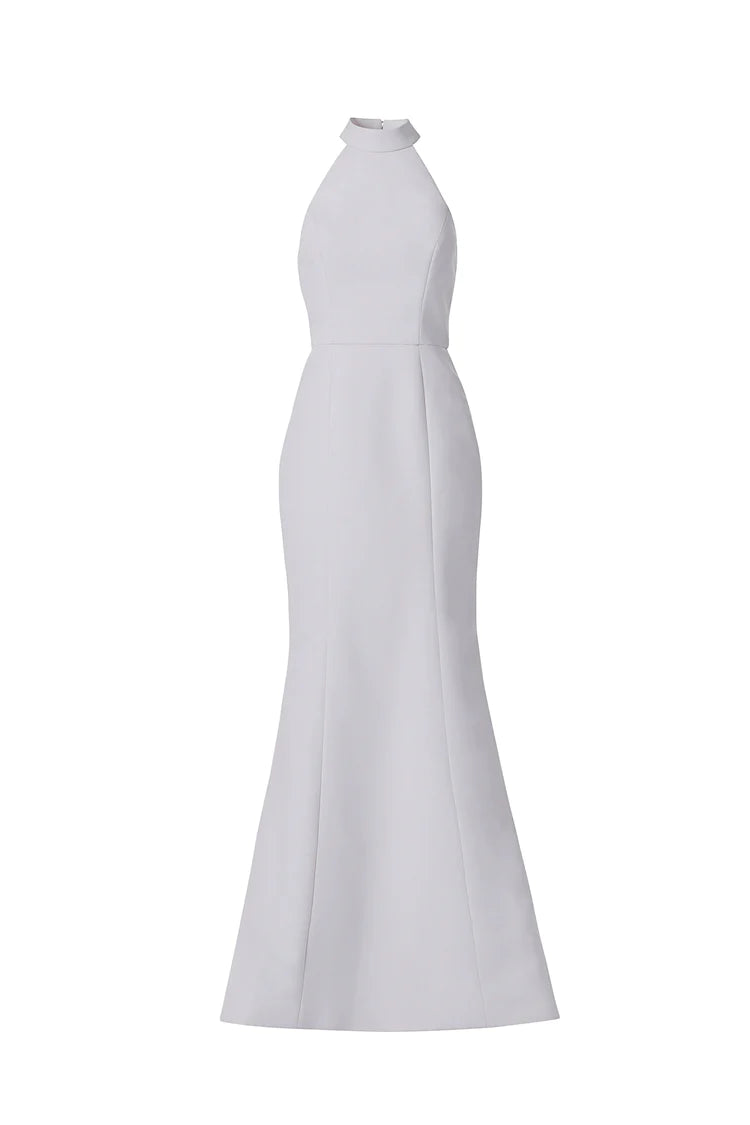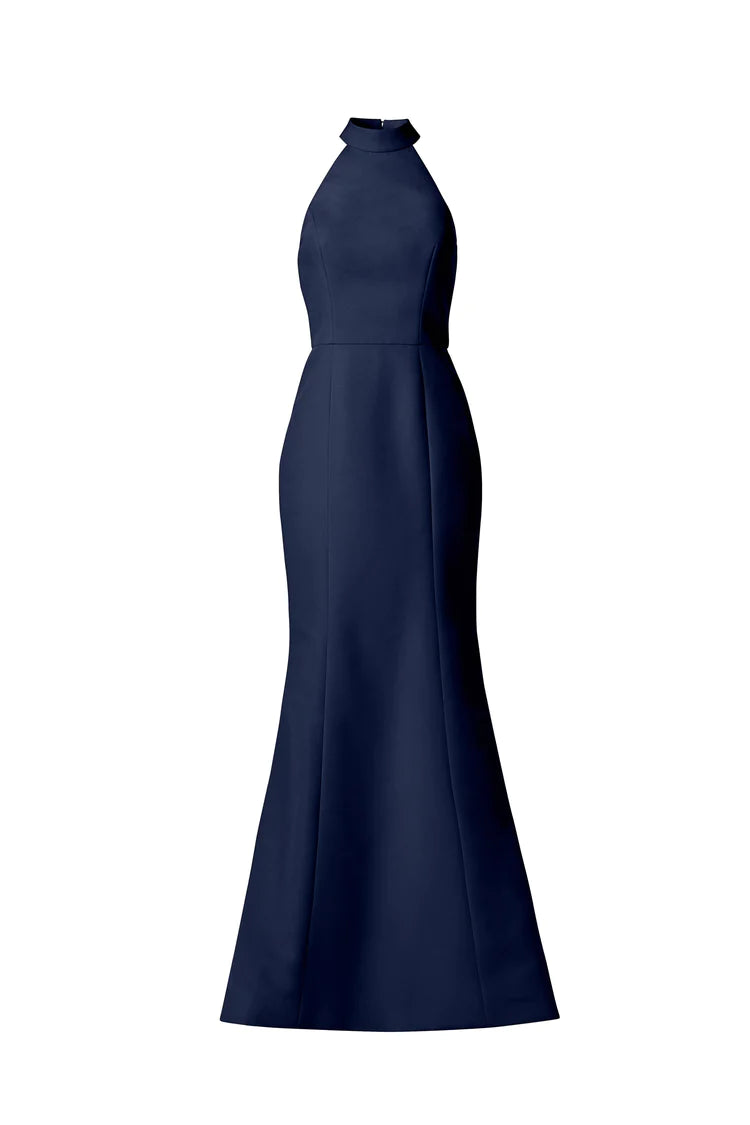 The Austin gown is streamlined and modern with a high neck halter and structured fit-to-flare skirt in Faille. The high collar is fastened at the back of the neck with stylish buttons. This modern and chic gown is sure to make a lasting impression.