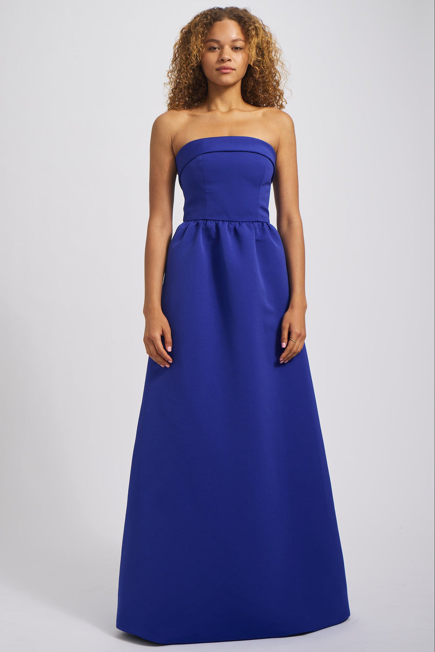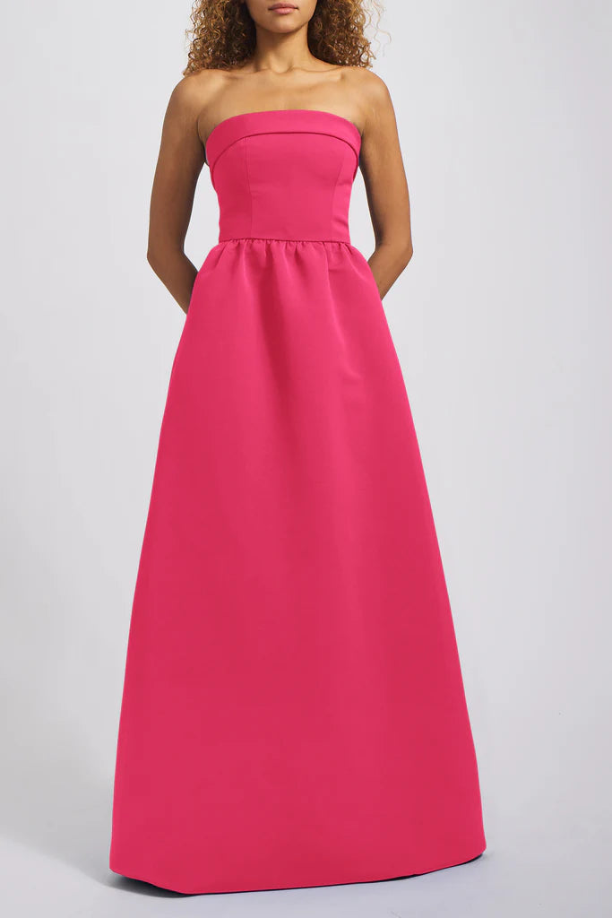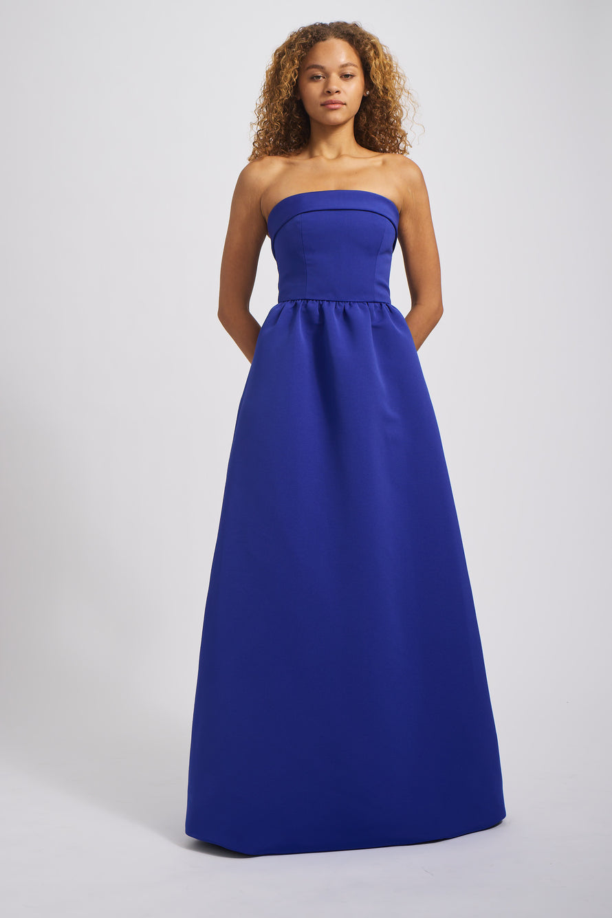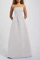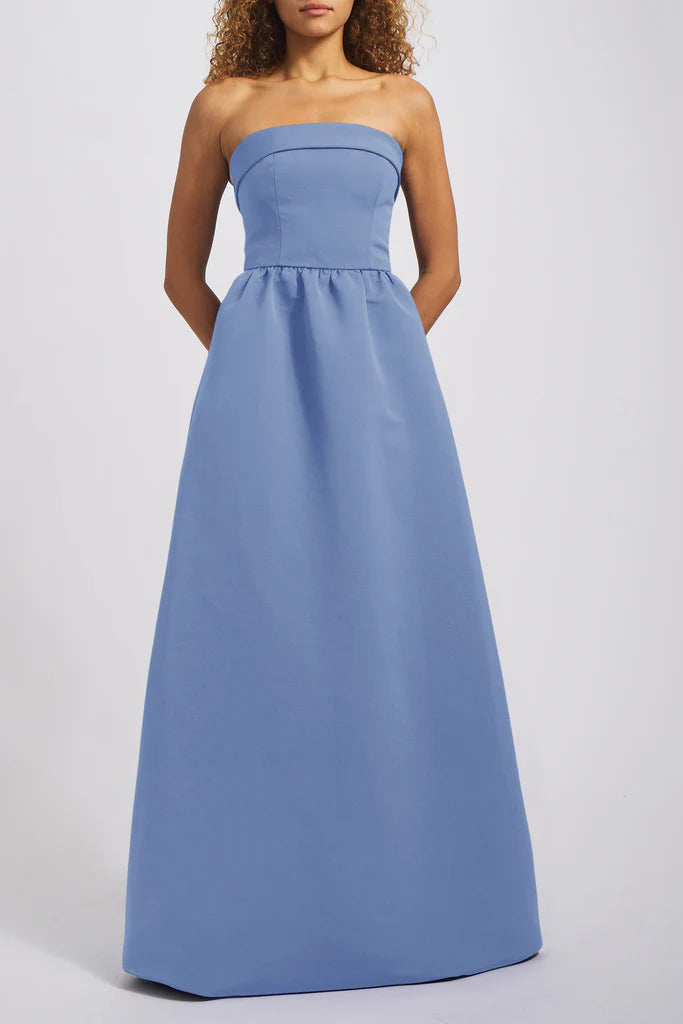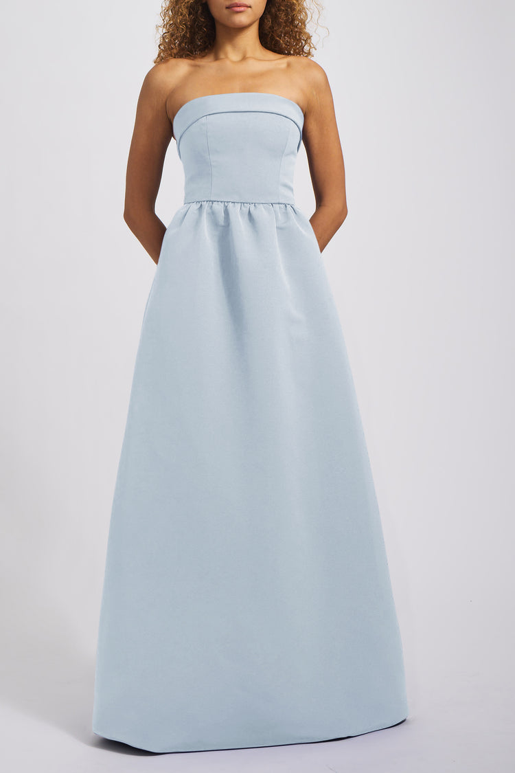 The Rene's classic silhouette has a relaxed feel in our Faille fabric featuring a tailored foldover strapless bodice and a wide, structured dirndl skirt with pockets. This simple yet stylish gown is an excellent choice for any bridal party!